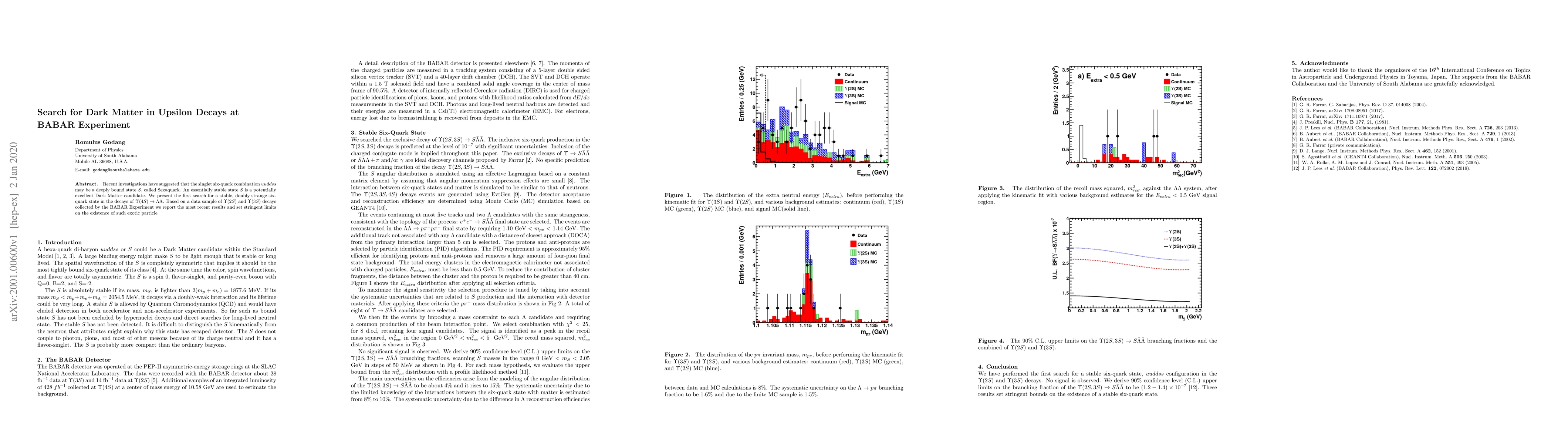 Recent investigations have suggested that the singlet six-quark combination $uuddss$ may be a deeply bound state $S$, called Sexaquark. An essentially stable state $S$ is a potentially excellent Dark Matter candidate. We present the first search for a stable, doubly strange six-quark state in the decays of $\Upsilon(4S) \to \Lambda \bar{\Lambda}$. Based on a data sample of $\Upsilon(2S)$ and $\Upsilon(3S)$ decays collected by the BABAR Experiment we report the most recent results and set stringent limits on the existence of such exotic particle.