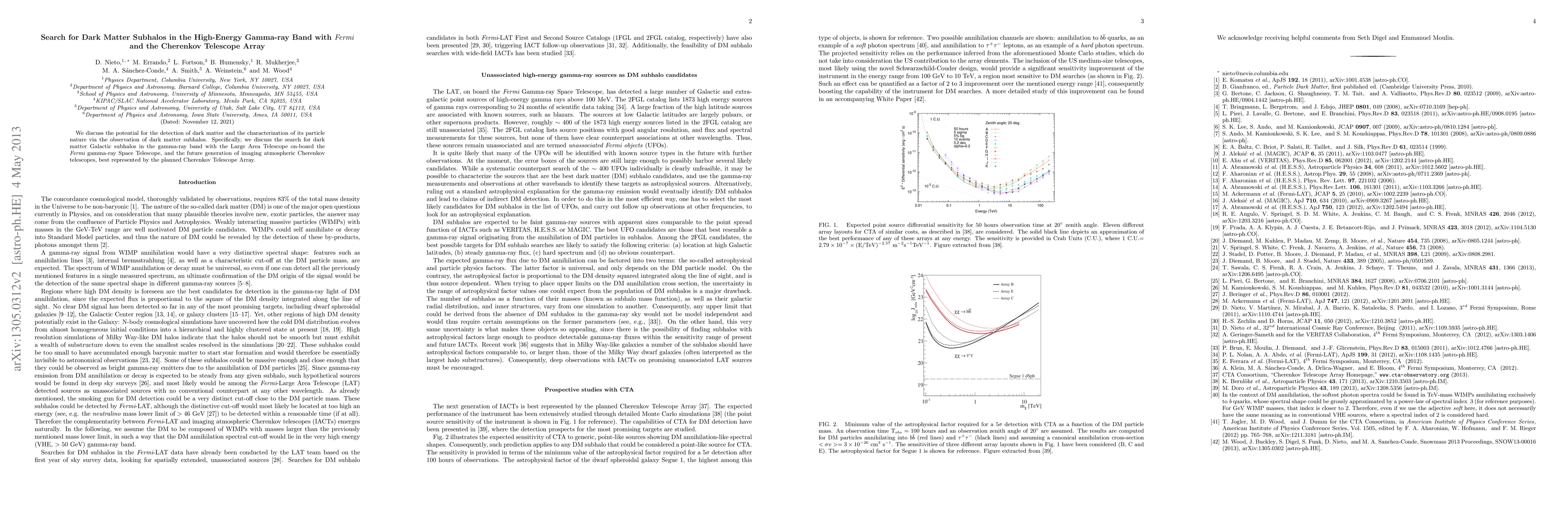 This paper explores the potential of detecting dark matter subhalos through gamma-ray observations using the Fermi Large Area Telescope and future Cherenkov Telescope Array, aiming to characterize dark matter's particle nature. The study focuses on Galactic subhalos in the high-energy gamma-ray band.