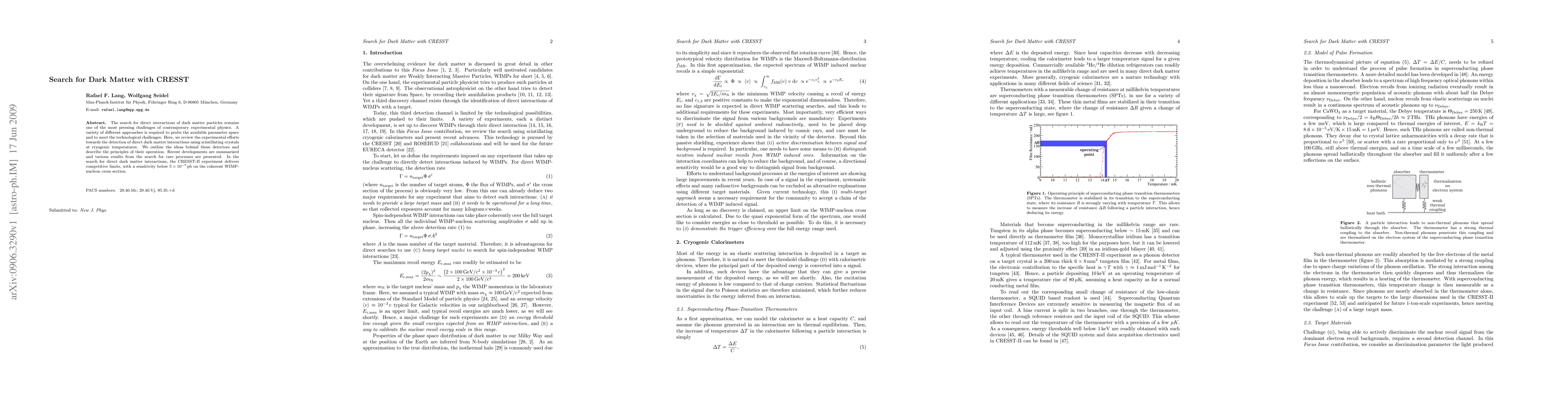 The search for direct interactions of dark matter particles remains one of the most pressing challenges of contemporary experimental physics. A variety of different approaches is required to probe the available parameter space and to meet the technological challenges. Here, we review the experimental efforts towards the detection of direct dark matter interactions using scintillating crystals at cryogenic temperatures. We outline the ideas behind these detectors and describe the principles of their operation. Recent developments are summarized and various results from the search for rare processes are presented. In the search for direct dark matter interactions, the CRESST-II experiment delivers competitive limits, with a sensitivity below 5x10^(-7) pb on the coherent WIMP-nucleon cross section.