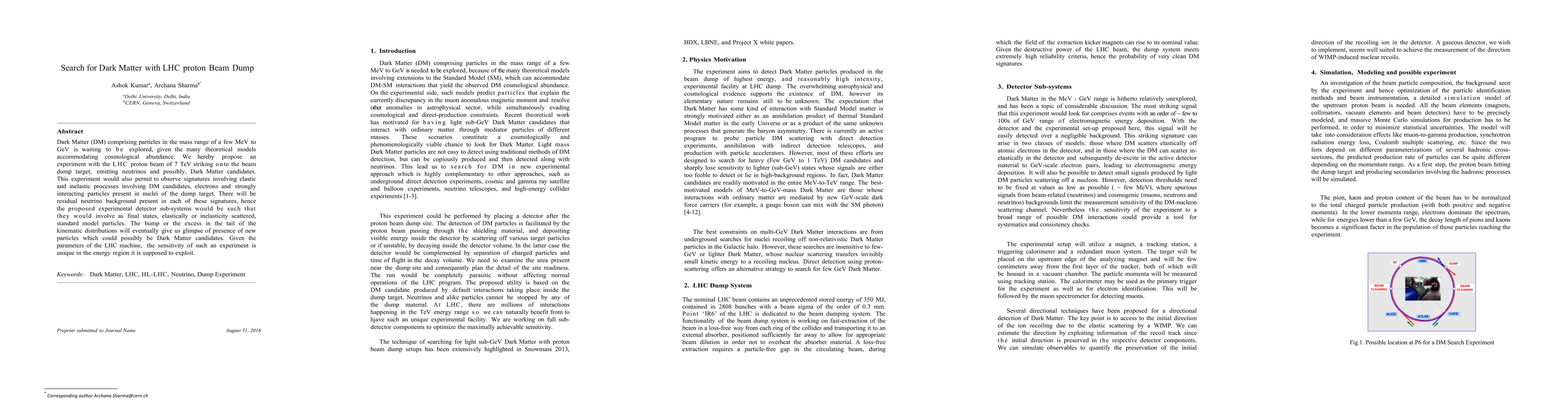 Dark Matter (DM) comprising particles in the mass range of a few MeV to GeV is waiting to be explored, given the many theoretical models accommodating cosmological abundance. We hereby propose an experiment with the LHC proton beam of 7 TeV striking onto the beam dump target, emitting neutrinos and possibly, Dark Matter candidates. This experiment would also permit to observe signatures involving elastic and inelastic processes involving DM candidates, electrons and strongly interacting particles present in nuclei of the dump target. There will be residual neutrino background present in each of these signatures, hence the proposed experimental detector sub-systems would be such that they would involve as final states, elastically or inelasticity scattered, standard model particles. The bump or the excess in the tail of the kinematic distributions will eventually give us glimpse of presence of new particles which could possibly be Dark Matter candidates. Given the parameters of the LHC machine, the sensitivity of such an experiment is unique in the energy region it is supposed to exploit.