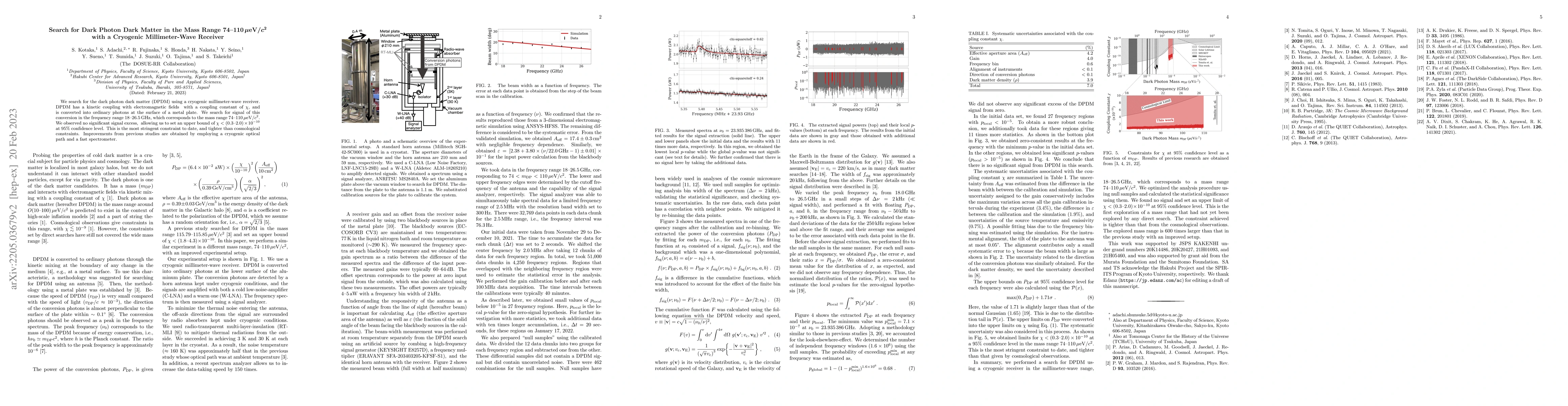 This paper investigates dark photon dark matter (DPDM) in the mass range of $74\mbox{--}110\,\mu\mathrm{eV}/c^2$ using a cryogenic millimeter-wave receiver. The study sets the most stringent upper bound on the coupling constant $\chi$ at $(0.3\text{--}2.0)\times 10^{-10}$ at 95% confidence level, surpassing previous cosmological constraints.