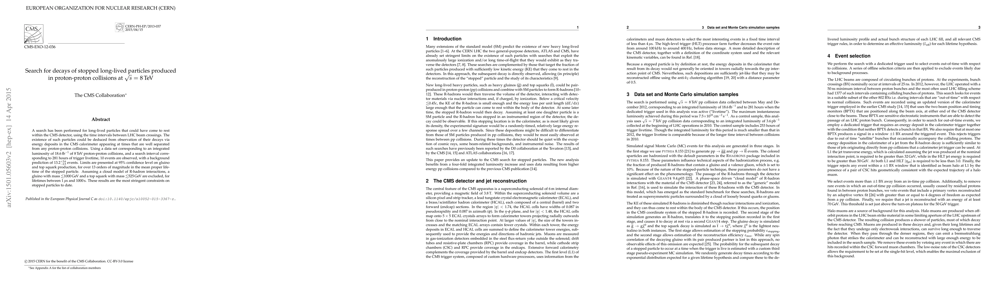 This paper reports a search for long-lived particles in proton-proton collisions at 8 TeV, observing 10 events against a predicted background of 13.2 events. It sets stringent limits on gluino and top squark production, excluding gluinos with mass < 1000 GeV and top squarks with mass < 525 GeV for lifetimes between 1 microsecond and 1000 seconds.