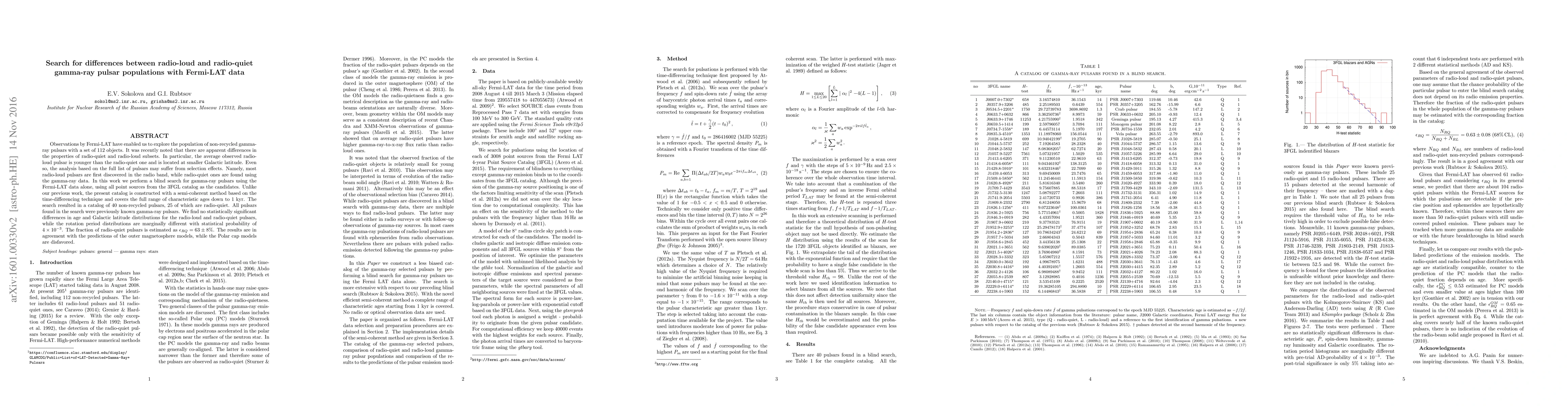 This study uses Fermi-LAT data to identify gamma-ray pulsars, finding no significant differences in age and galactic latitude between radio-loud and radio-quiet pulsars, but a marginally significant difference in rotation periods. The results support outer magnetosphere models for pulsar emission.