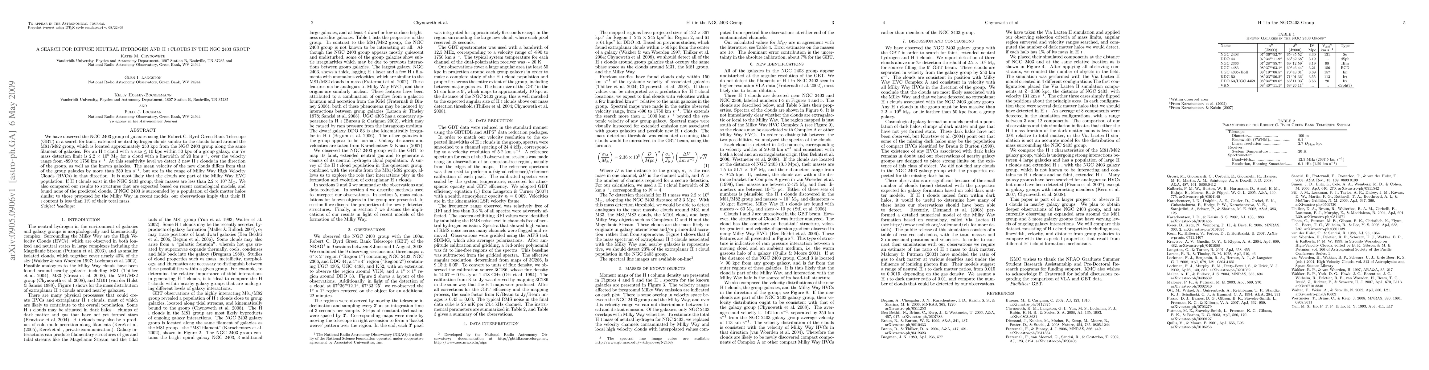 We have observed the NGC 2403 group of galaxies using the Robert C. Byrd Green Bank Telescope (GBT) in a search for faint, extended neutral hydrogen clouds similar to the clouds found around the M81/M82 group, which is located approximately 250 kpc from the NGC 2403 group along the same filament of galaxies. For an HI cloud with a size < 10 kpc within 50 kpc of a group galaxy, our 7-sigma mass detection limit is 2.2 x 10^6 M_sun for a cloud with a linewidth of 20 km/s, over the velocity range from -890 to 1750 km/s. At this sensitivity level we detect 3 new HI clouds in the direction of the group, as well as the known galaxies. The mean velocity of the new clouds differs from that of the group galaxies by more than 250 km/s, but are in the range of Milky Way High Velocity Clouds (HVCs) in that direction. It is most likely that the clouds are part of the Milky Way HVC population. If HI clouds exist in the NGC 2403 group, their masses are less than 2.2 x 10^6 M_sun. We also compared our results to structures that are expected based on recent cosmological models, and found none of the predicted clouds. If NGC 2403 is surrounded by a population of dark matter halos similar to those proposed for the Milky Way in recent models, our observations imply that their HI content is less than 1% of their total mass.