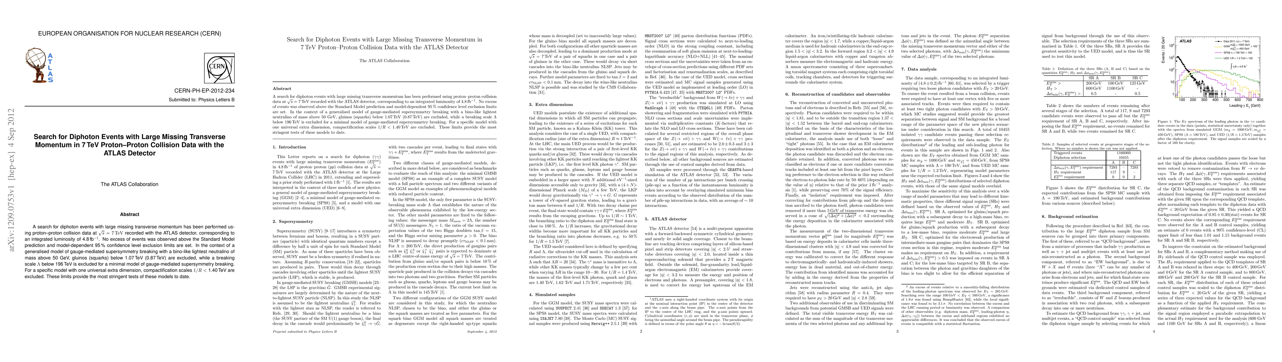 The ATLAS detector analyzed 7 TeV proton-proton collision data for diphoton events with large missing transverse momentum, finding no excess over Standard Model predictions. Exclusion limits for several supersymmetric and extra-dimensional models were set, providing stringent tests for these theories.