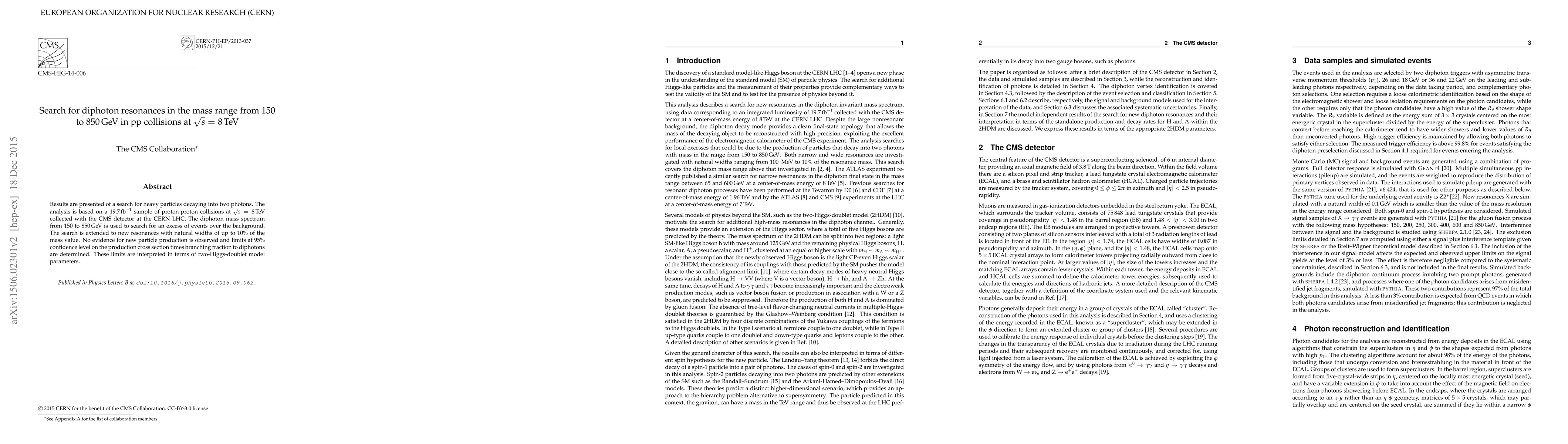 Results are presented of a search for heavy particles decaying into two photons. The analysis is based on a 19.7 inverse femtobarn sample of proton-proton collisions at sqrt(s) = 8 TeV collected with the CMS detector at the CERN LHC. The diphoton mass spectrum from 150 to 850 GeV is used to search for an excess of events over the background. The search is extended to new resonances with natural widths of up to 10% of the mass value. No evidence for new particle production is observed and limits at 95% confidence level on the production cross section times branching fraction to diphotons are determined. These limits are interpreted in terms of two-Higgs-doublet model parameters.
