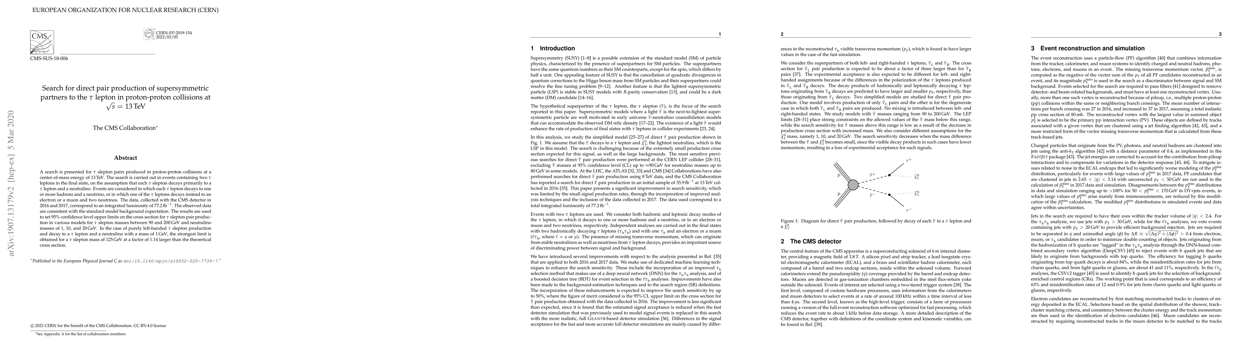 This study, conducted by the CMS collaboration, searched for direct production of supersymmetric tau sleptons in proton-proton collisions at 13 TeV. Using data from 2016 and 2017 with an integrated luminosity of 77.2 fb^-1, the research focused on events with two tau leptons, assuming each tau slepton decays to a tau lepton and a neutralino. No significant excess over standard model background was found, leading to 95% confidence level upper limits set for the cross section of tau slepton pair production across various masses and neutralino mass scenarios. The strongest limit, 1.14 times the theoretical cross section, was observed for left-handed tau slepton production with a neutralino mass of 1 GeV at a tau slepton mass of 125 GeV.