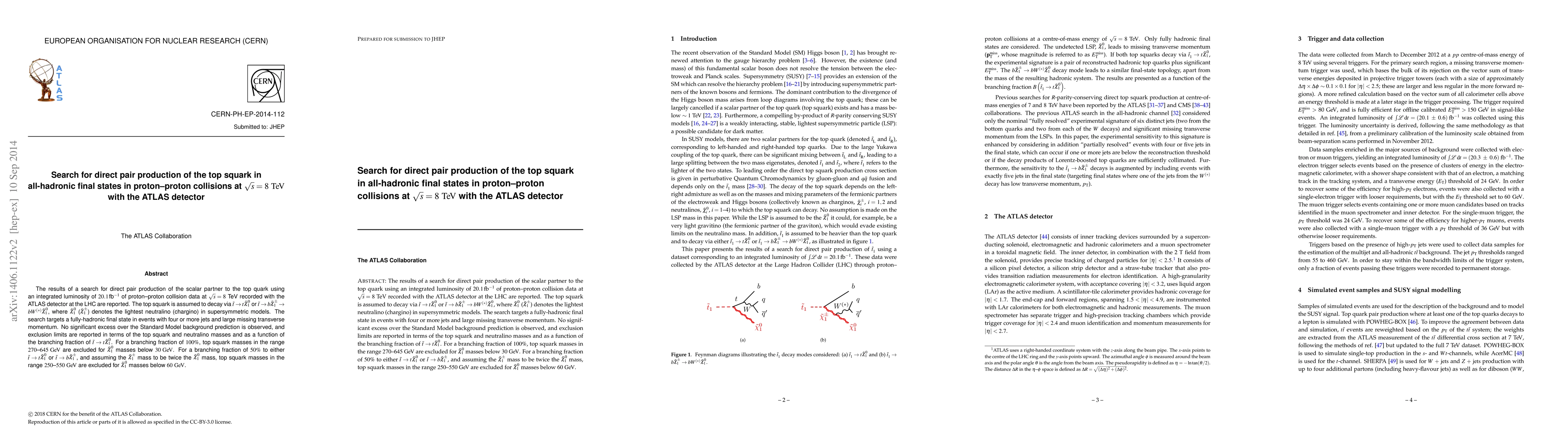 The results of a search for direct pair production of the scalar partner to the top quark using an integrated luminosity of $20.1 \rm{fb}^{-1}$ of proton-proton collision data at $\sqrt{s}=8$ TeV recorded with the ATLAS detector at the LHC are reported. The top squark is assumed to decay via $\tilde{t} \rightarrow t \tilde{\chi}_{1}^{0}$ or $\tilde{t}\rightarrow b\tilde{\chi}_{1}^{\pm} \rightarrow b W^{\left(\ast\right)} \tilde{\chi}_{1}^{0}$, where $\tilde{\chi}_{1}^{0}$ ($\tilde{\chi}_{1}^{\pm}$) denotes the lightest neutralino (chargino) in supersymmetric models. The search targets a fully-hadronic final state in events with four or more jets and large missing transverse momentum. No significant excess over the Standard Model background prediction is observed, and exclusion limits are reported in terms of the top squark and neutralino masses and as a function of the branching fraction of $\tilde{t} \rightarrow t \tilde{\chi}_{1}^{0}$. For a branching fraction of 100%, top squark masses in the range 270-645 GeV are excluded for $\tilde{\chi}_{1}^{0}$ masses below 30 GeV. For a branching fraction of 50% to either $\tilde{t} \rightarrow t \tilde{\chi}_{1}^{0}$ or $\tilde{t}\rightarrow b\tilde{\chi}_{1}^{\pm}$, and assuming the $\tilde{\chi}_{1}^{\pm}$ mass to be twice the $\tilde{\chi}_{1}^{0}$ mass, top squark masses in the range 250-550 GeV are excluded for $\tilde{\chi}_{1}^{0}$ masses below 60 GeV.