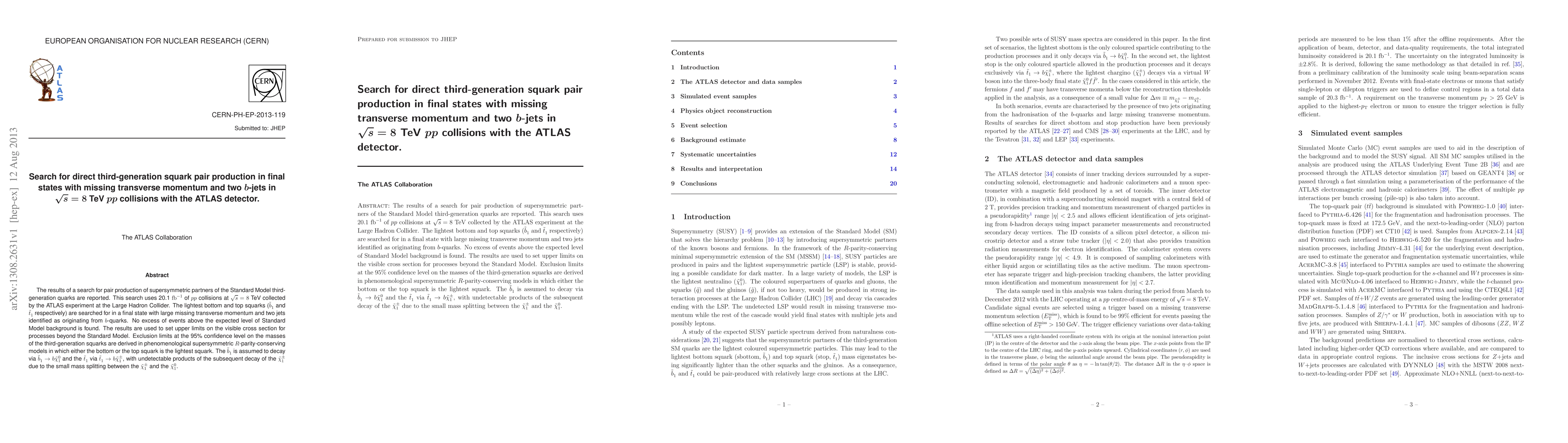 This paper reports a search for pair production of third-generation squarks using 20.1 fb^-1 of 8 TeV proton-proton collision data from the ATLAS experiment. No significant excess above Standard Model predictions was found, leading to new exclusion limits on the masses of the lightest bottom and top squarks.