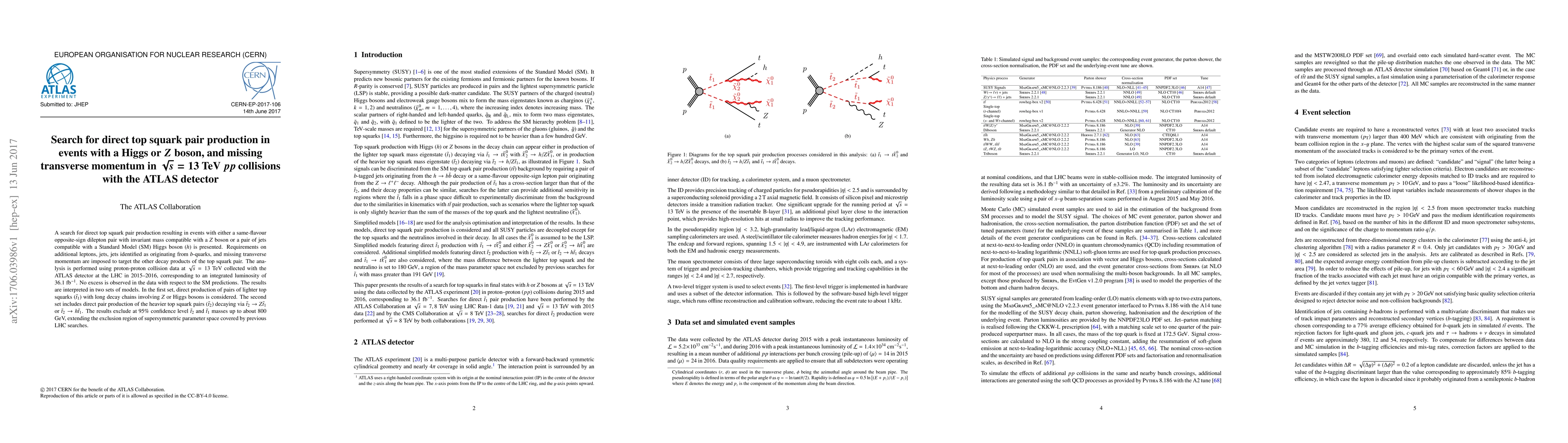 This paper reports a search for direct top squark pair production in proton-proton collisions at $\sqrt{s}=13$ TeV using the ATLAS detector, focusing on events with either a $Z$ boson or a Higgs boson. No excess is observed, leading to exclusion of top squark masses up to 800 GeV in various supersymmetric models.