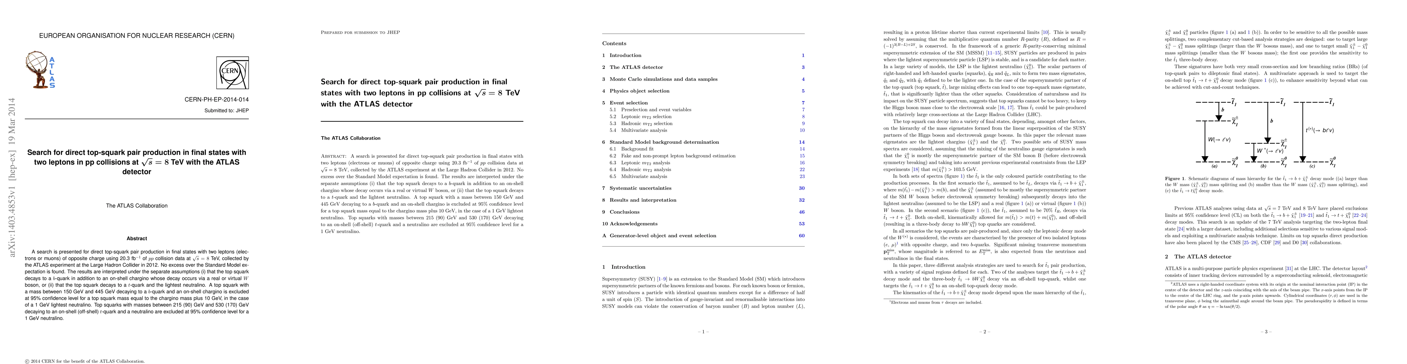 A search is presented for direct top-squark pair production in final states with two leptons (electrons or muons) of opposite charge using 20.3fb-1 of pp collision data at sqrt(s)=8TeV, collected by the ATLAS experiment at the Large Hadron Collider in 2012. No excess over the Standard Model expectation is found. The results are interpreted under the separate assumptions (i) that the top squark decays to a b-quark in addition to an on-shell chargino whose decay occurs via a real or virtual W boson, or (ii) that the top squark decays to a t-quark and the lightest neutralino. A top squark with a mass between 150 GeV and 445 GeV decaying to a b-quark and an on-shell chargino is excluded at 95% confidence level for a top squark mass equal to the chargino mass plus 10 GeV, in the case of a 1 GeV lightest neutralino. Top squarks with masses between 215 (90) GeV and 530 (170) GeV decaying to an on-shell (off-shell) t-quark and a neutralino are excluded at 95% confidence level for a 1 GeV neutralino.