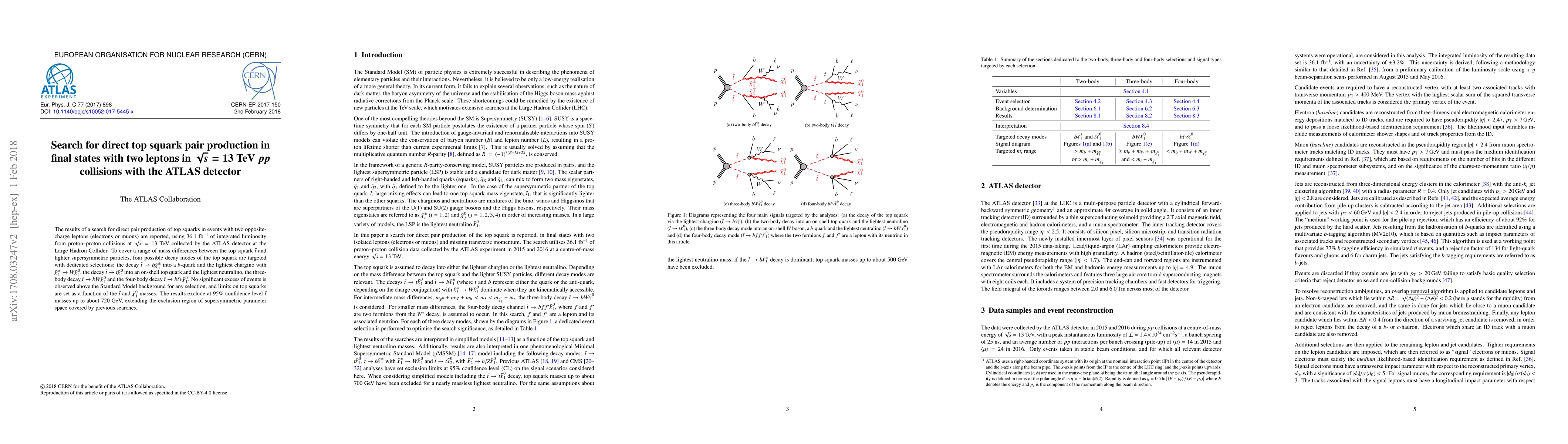 This study by ATLAS detector at LHC searched for direct top squark pair production in events with two leptons (electrons or muons) using 36.1 fb$^{-1}$ of 13 TeV pp collision data. No significant evidence of top squarks was found, leading to exclusion of top squark masses up to approximately 720 GeV at 95% CL, thus expanding the excluded supersymmetric parameter space.