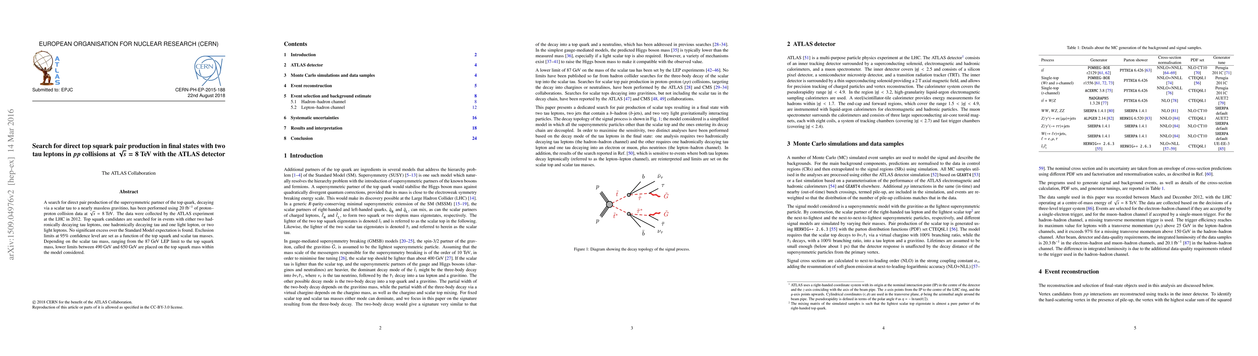 A search for direct pair production of the supersymmetric partner of the top quark, decaying via a scalar tau to a nearly massless gravitino, has been performed using 20 fb$^{-1}$ of proton-proton collision data at $\sqrt{s}=8$ TeV. The data were collected by the ATLAS experiment at the LHC in 2012. Top squark candidates are searched for in events with either two hadronically decaying tau leptons, one hadronically decaying tau and one light lepton, or two light leptons. No significant excess over the Standard Model expectation is found. Exclusion limits at 95% confidence level are set as a function of the top squark and scalar tau masses. Depending on the scalar tau mass, ranging from the 87 GeV LEP limit to the top squark mass, lower limits between 490 GeV and 650 GeV are placed on the top squark mass within the model considered.