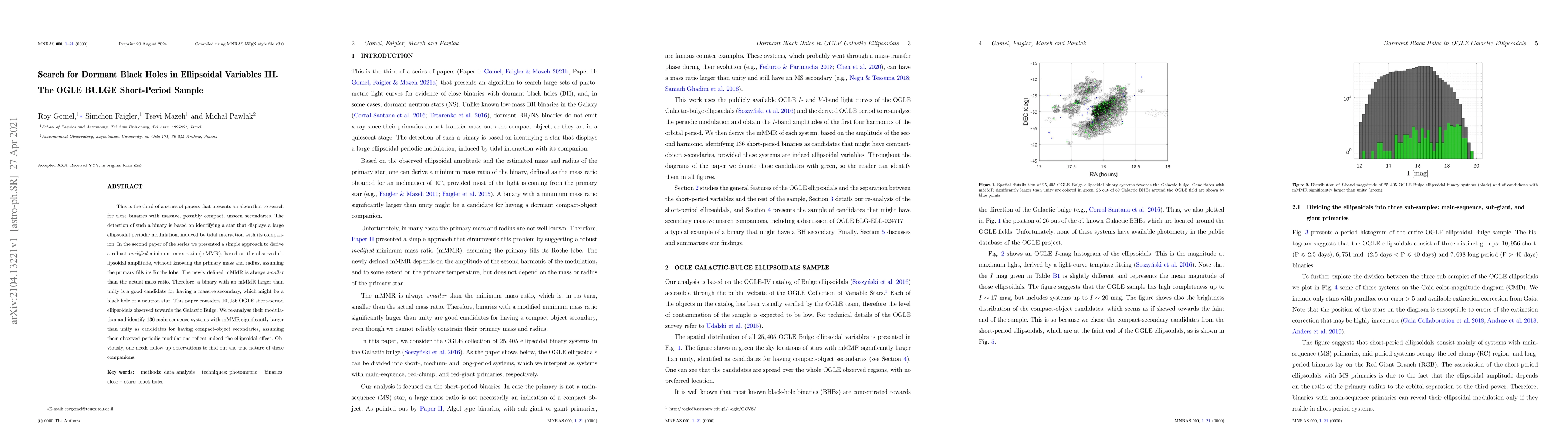 This is the third of a series of papers that presents an algorithm to search for close binaries with massive, possibly compact, unseen secondaries. The detection of such a binary is based on identifying a star that displays a large ellipsoidal periodic modulation, induced by tidal interaction with its companion. In the second paper of the series we presented a simple approach to derive a robust modified minimum mass ratio (mMMR), based on the observed ellipsoidal amplitude, without knowing the primary mass and radius, assuming the primary fills its Roche lobe. The newly defined mMMR is always smaller than the actual mass ratio. Therefore, a binary with an mMMR larger than unity is a good candidate for having a massive secondary, which might be a black hole or a neutron star. This paper considers 10,956 OGLE short-period ellipsoidals observed towards the Galactic Bulge. We re-analyse their modulation and identify 136 main-sequence systems with mMMR significantly larger than unity as candidates for having compact-object secondaries, assuming their observed periodic modulations reflect indeed the ellipsoidal effect. Obviously, one needs follow-up observations to find out the true nature of these companions.