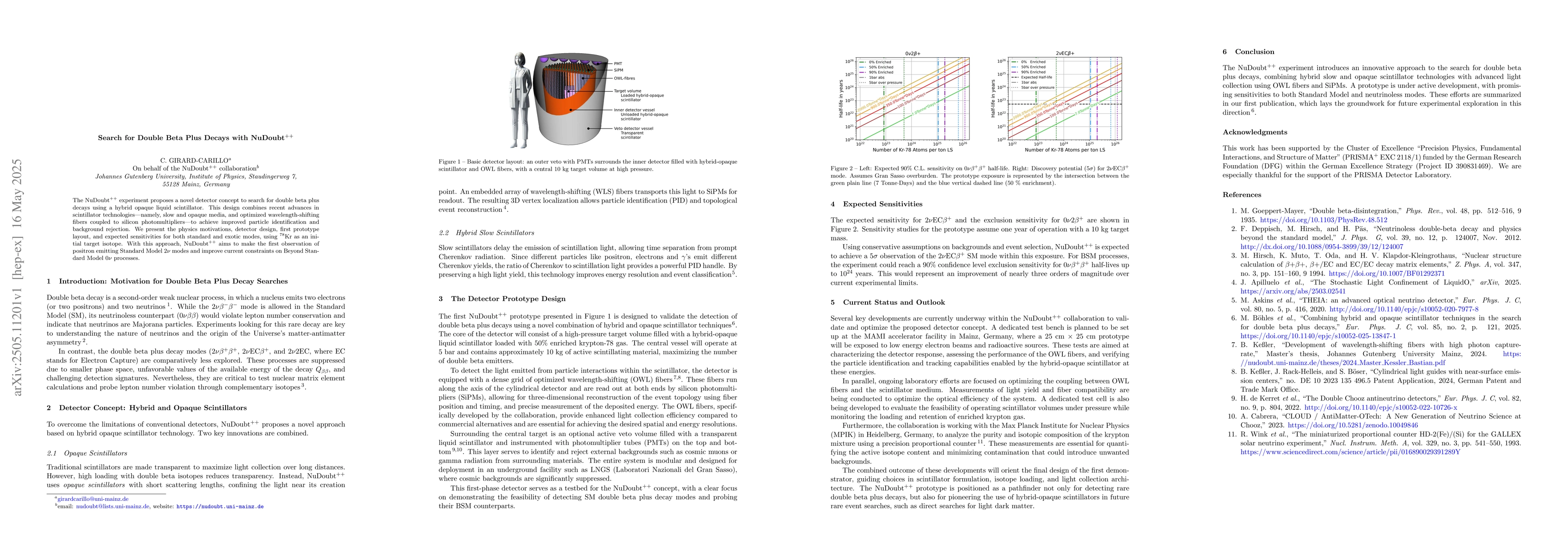 NuDoubt++ distinguishes itself by employing a hybrid opaque liquid scintillator, leveraging recent technological advancements to enhance sensitivity and background discrimination in double beta plus decay searches, which sets it apart from previous detector designs.