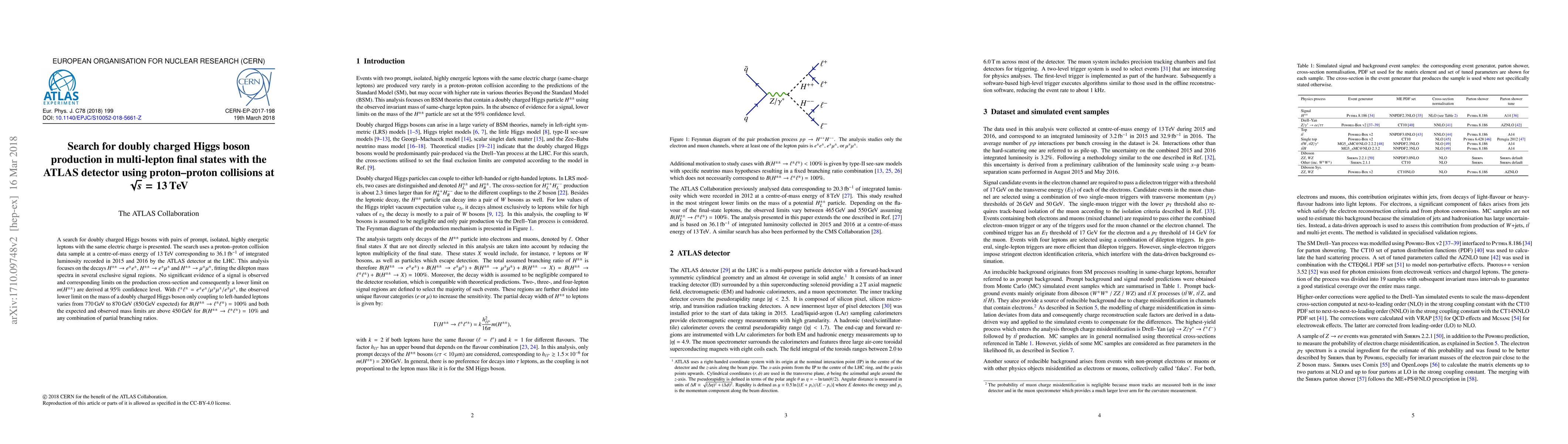 This paper reports a search for doubly charged Higgs bosons in multi-lepton final states using data from proton-proton collisions at 13 TeV with the ATLAS detector. No significant evidence of such particles was found, leading to derived limits on their production cross-section and setting lower mass limits above 770 GeV for certain decay channels.