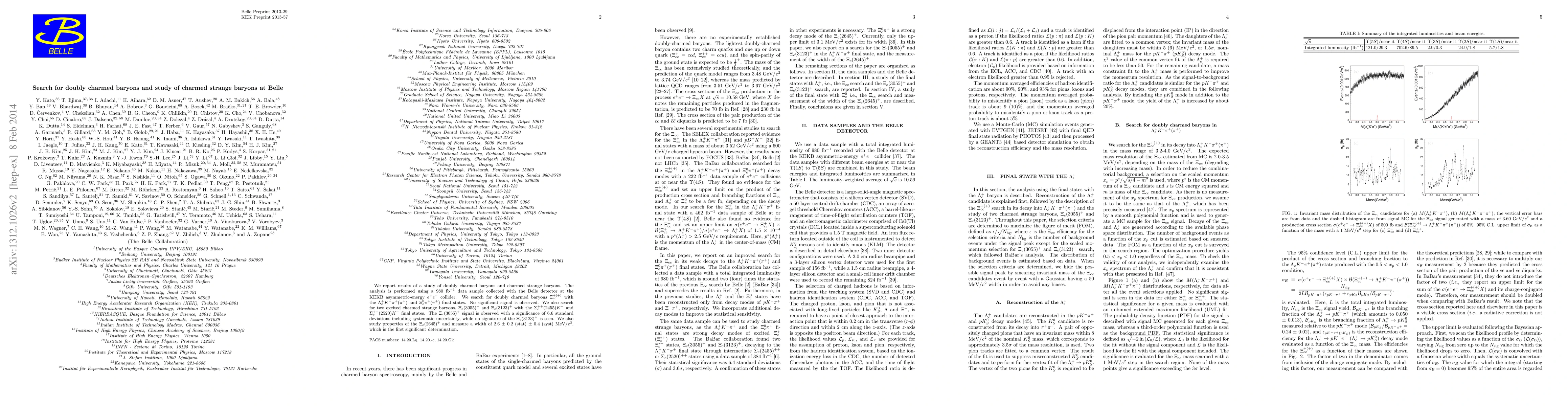 The Belle experiment at KEKB searched for doubly charmed baryons and charmed strange baryons using a 980 fb^-1 data sample, observing a signal for Xi_c(3055)^+ with 6.6 standard deviations significance but no evidence for Xi_c(3123)^+ or doubly charmed baryons. Additionally, the Xi_c(2645)^+ was studied for the first time, determining its width to be 2.6 ± 0.2 (stat) ± 0.4 (syst) MeV/c^2.