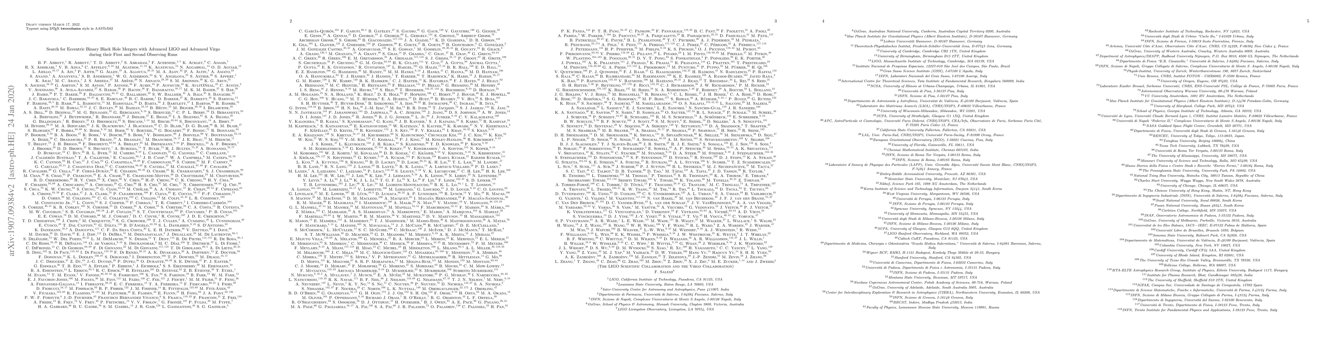 A study searched for binary black hole mergers with eccentric orbits using data from LIGO and Virgo's first and second observing runs, but found no new candidates, offering insights into eccentric binary formation models.