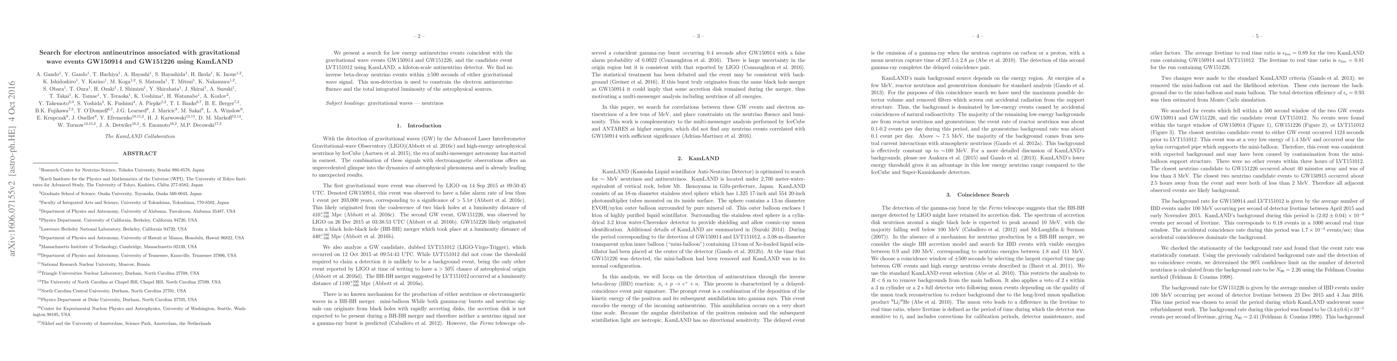 A search for electron antineutrinos associated with gravitational wave events GW150914 and GW151226 was conducted using KamLAND detector; no inverse beta-decay neutrino events were detected.