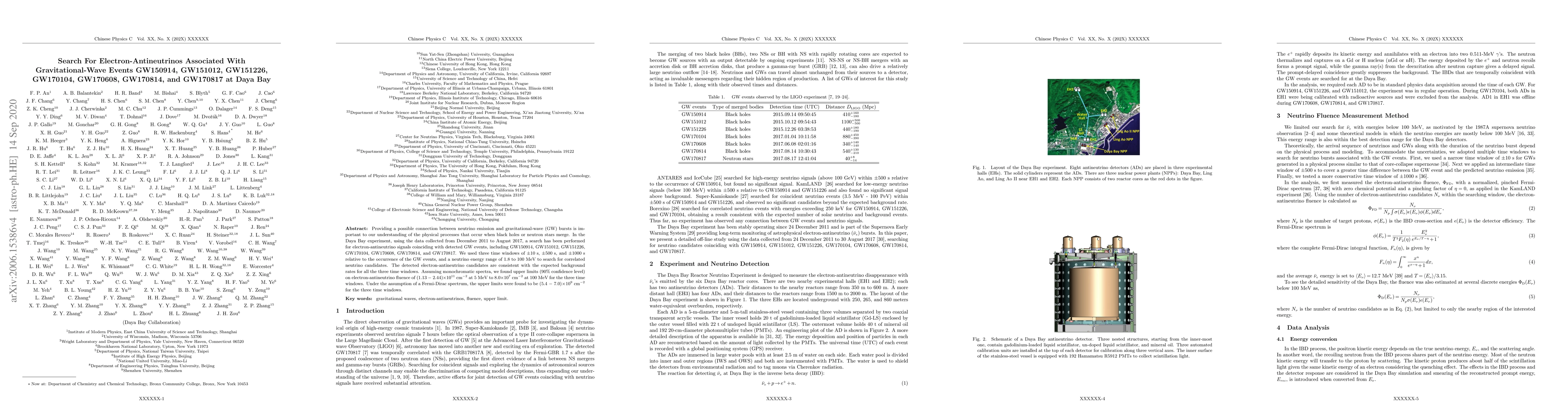 The Daya Bay experiment searched for electron-antineutrino signals associated with gravitational-wave events from black hole or neutron star mergers, but found no significant excess above background. Upper limits on electron-antineutrino fluence were established for various time windows and energy spectra.
