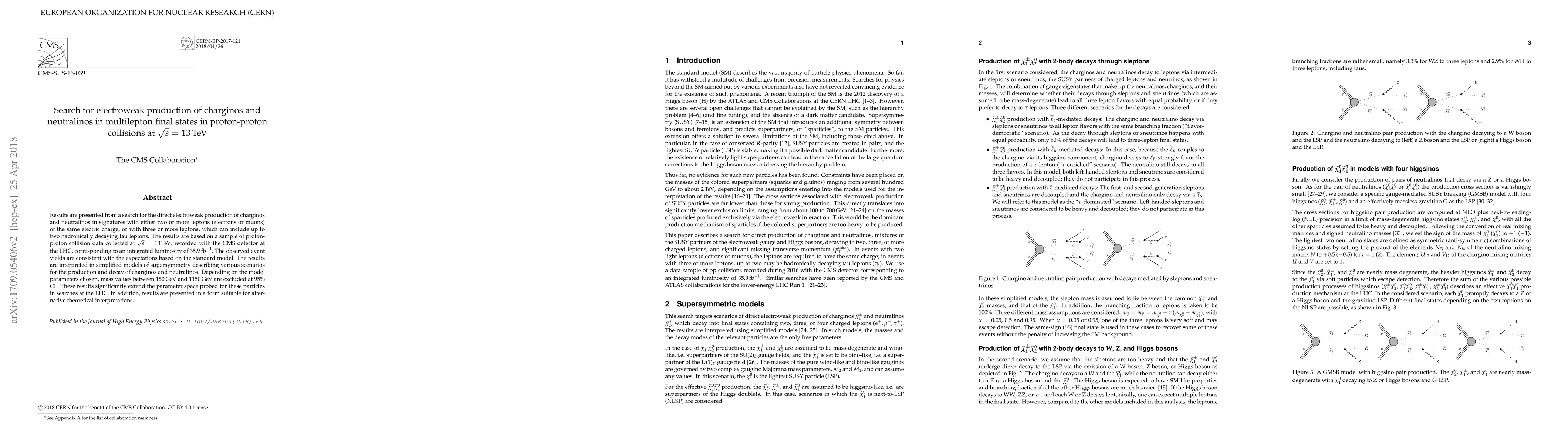 This paper reports on a search for electroweak production of charginos and neutralinos in multilepton final states using data from proton-proton collisions at 13 TeV. No significant deviations from standard model expectations were observed, leading to exclusions of chargino and neutralino masses between 180 GeV and 1150 GeV at 95% confidence level, extending the probed parameter space.