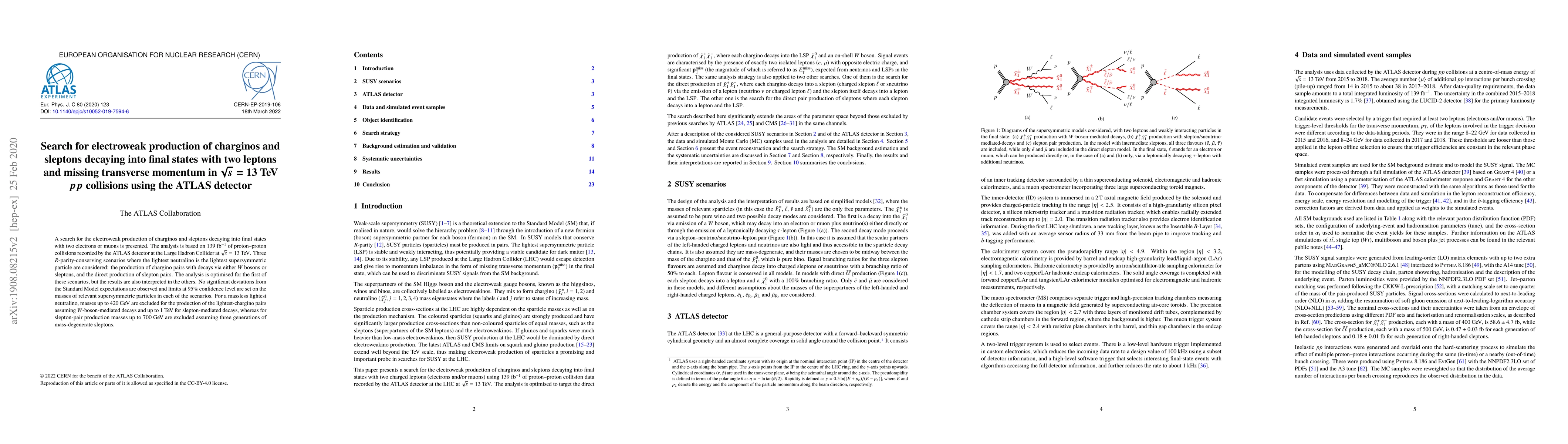 This paper reports a search for electroweak production of charginos and sleptons in proton-proton collisions at $\sqrt{s}=13$ TeV using the ATLAS detector, finding no significant deviations from Standard Model predictions. Mass limits are set for chargino pairs and slepton pairs, excluding up to 420 GeV for charginos and 700 GeV for sleptons under various decay scenarios.