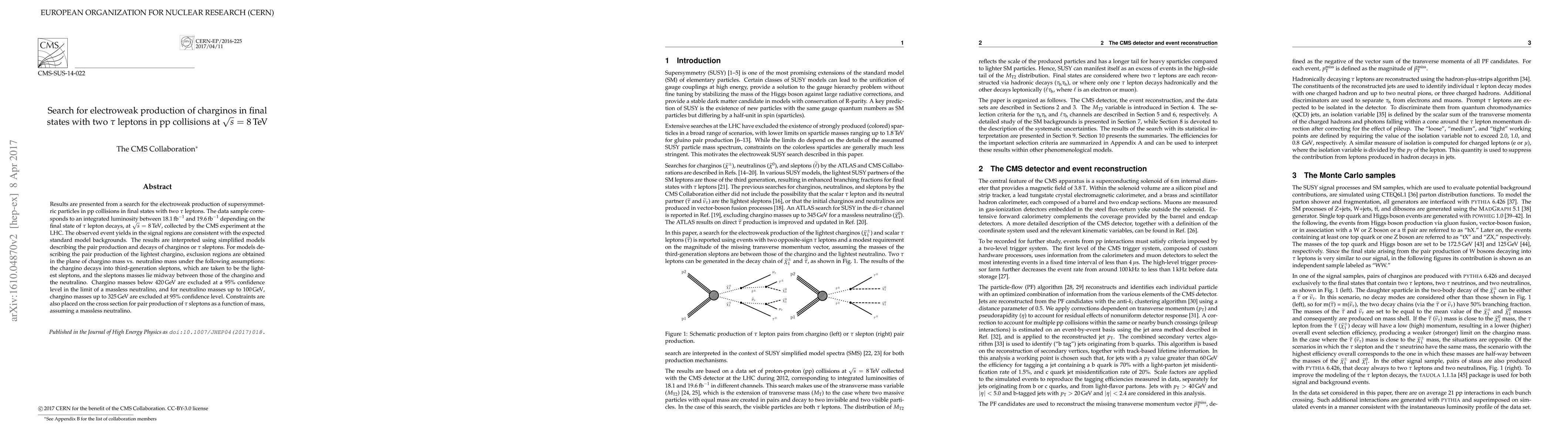 This paper reports a search for electroweak production of charginos in pp collisions at 8 TeV, focusing on final states with two tau leptons. The CMS experiment found no evidence of charginos, leading to exclusion limits on chargino masses up to 420 GeV and constraints on tau slepton pair production.