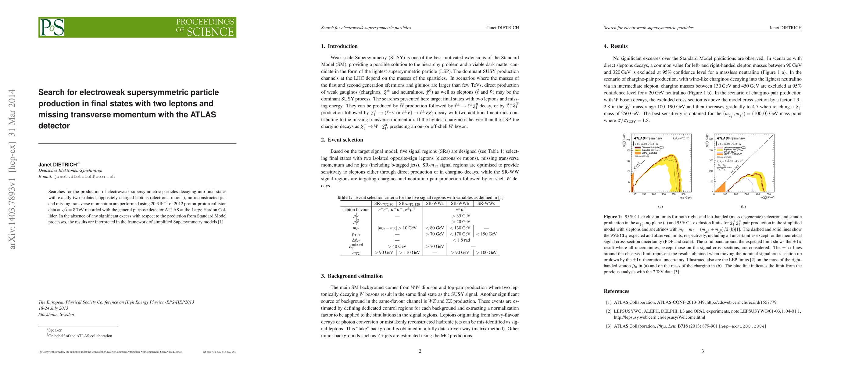 This paper investigates the production of electroweak supersymmetric particles using ATLAS data from 2012 proton-proton collisions at 8 TeV, focusing on events with two isolated, oppositely-charged leptons and missing transverse momentum. No significant excess over Standard Model predictions is observed, leading to constraints on simplified Supersymmetry models.