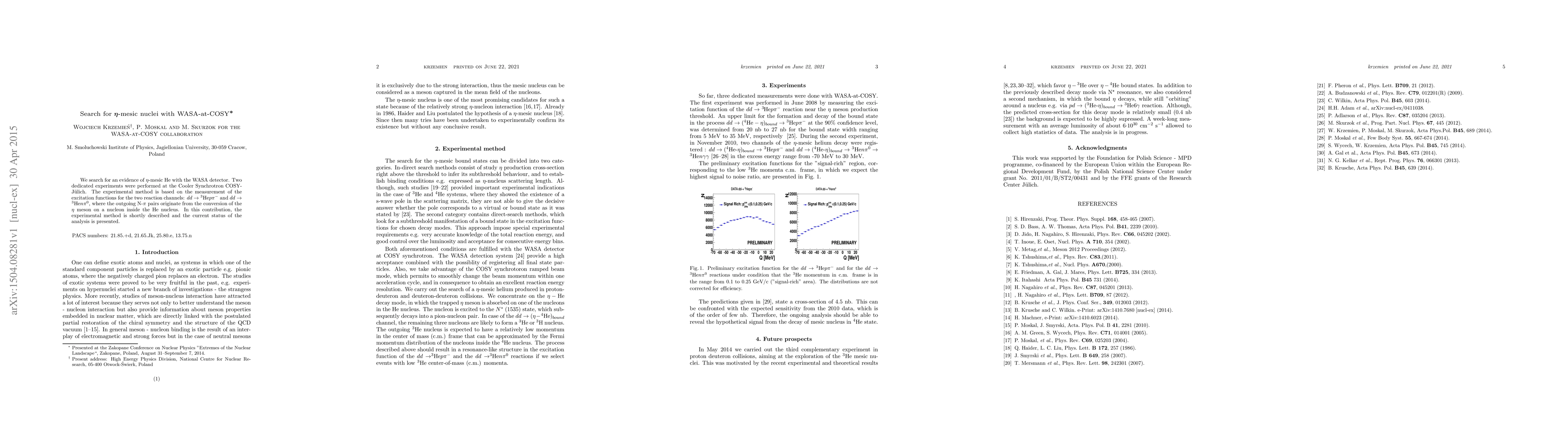 We search for an evidence of eta-mesic He with the WASA detector. Two dedicated experiments were performed at the Cooler Synchrotron COSY-Juelich. The experimental method is based on the measurement of the excitation functions for the two reaction channels: dd->3Heppi- and dd->3Henpi0, where the outgoing N-pi pairs originate from the conversion of the eta meson on a nucleon inside the He nucleus.In this contribution, the experimental method is shortly described and the current status of the analysis is presented.