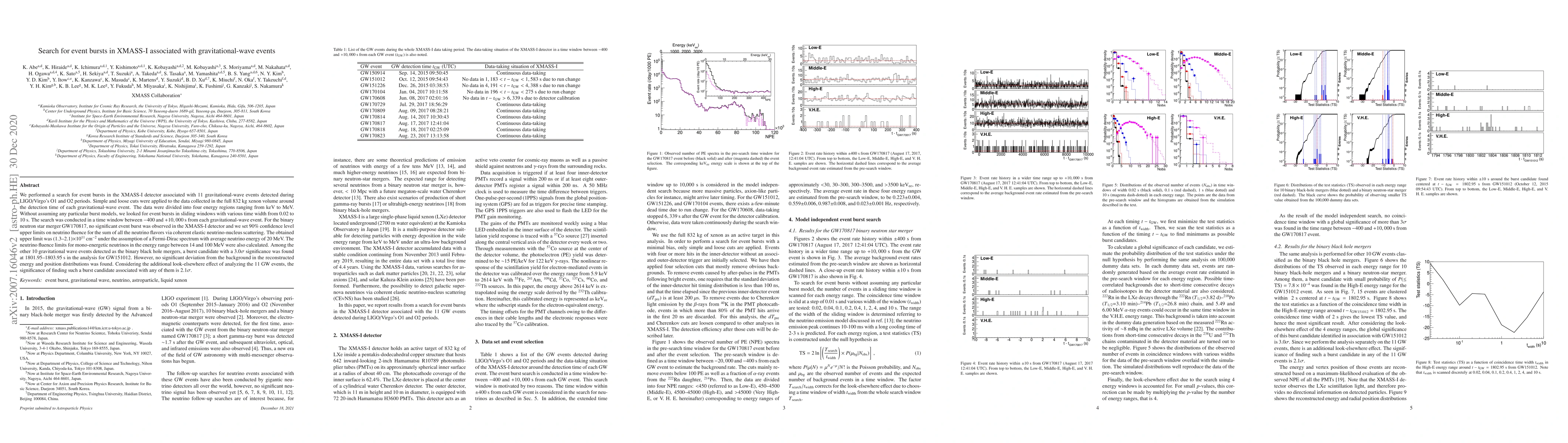 We performed a search for event bursts in the XMASS-I detector associated with 11 gravitational-wave events detected during LIGO/Virgo's O1 and O2 periods. Simple and loose cuts were applied to the data collected in the full 832 kg xenon volume around the detection time of each gravitational-wave event. The data were divided into four energy regions ranging from keV to MeV. Without assuming any particular burst models, we looked for event bursts in sliding windows with various time width from 0.02 to 10 s. The search was conducted in a time window between $-$400 and $+$10,000 s from each gravitational-wave event. For the binary neutron star merger GW170817, no significant event burst was observed in the XMASS-I detector and we set 90% confidence level upper limits on neutrino fluence for the sum of all the neutrino flavors via coherent elastic neutrino-nucleus scattering. The obtained upper limit was (1.3-2.1)$\times 10^{11}$ cm$^{-2}$ under the assumption of a Fermi-Dirac spectrum with average neutrino energy of 20 MeV. The neutrino fluence limits for mono-energetic neutrinos in the energy range between 14 and 100 MeV were also calculated. Among the other 10 gravitational wave events detected as the binary black hole mergers, a burst candidate with a 3.0$\sigma$ significance was found at 1801.95-1803.95 s in the analysis for GW151012. However, no significant deviation from the background in the reconstructed energy and position distributions was found. Considering the additional look-elsewhere effect of analyzing the 11 GW events, the significance of finding such a burst candidate associated with any of them is 2.1$\sigma$.