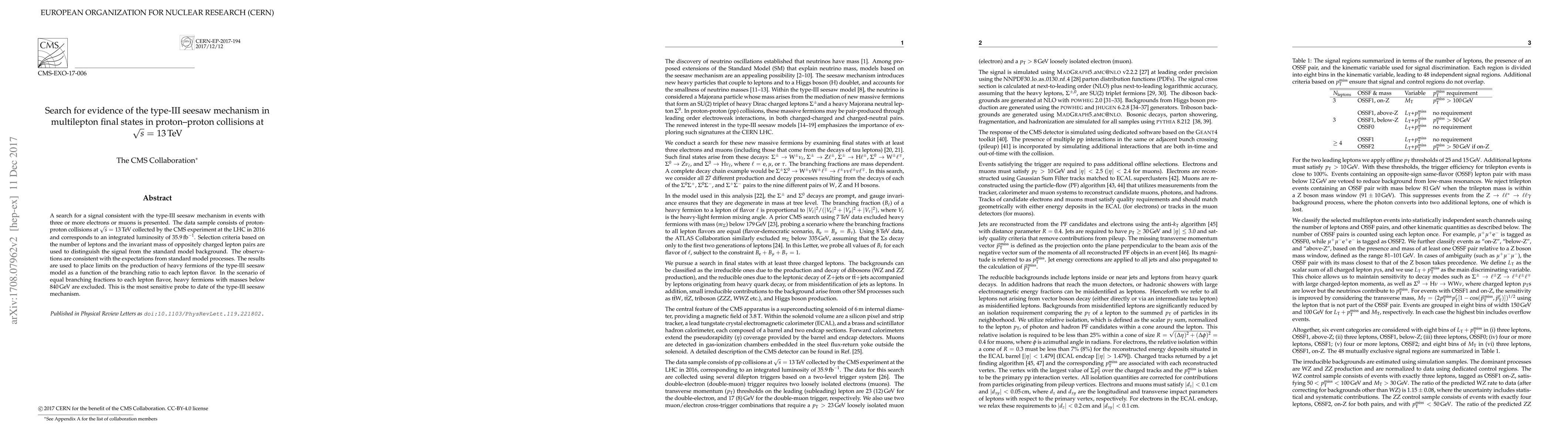 A search for a type-III seesaw mechanism in proton-proton collisions at 13 TeV finds no evidence, excluding heavy fermions with masses below 840 GeV in certain scenarios.