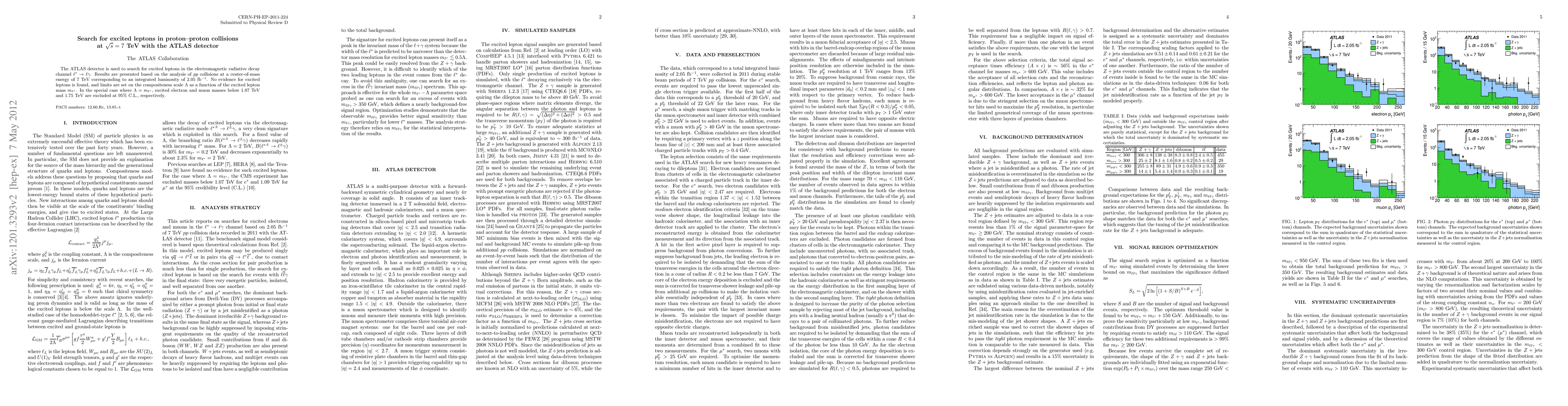 The ATLAS detector searched for excited leptons in proton-proton collisions at 7 TeV, finding no evidence for their existence. Limits on the compositeness scale were established, excluding excited electron and muon masses below 1.87 TeV and 1.75 TeV, respectively, at 95% confidence level.