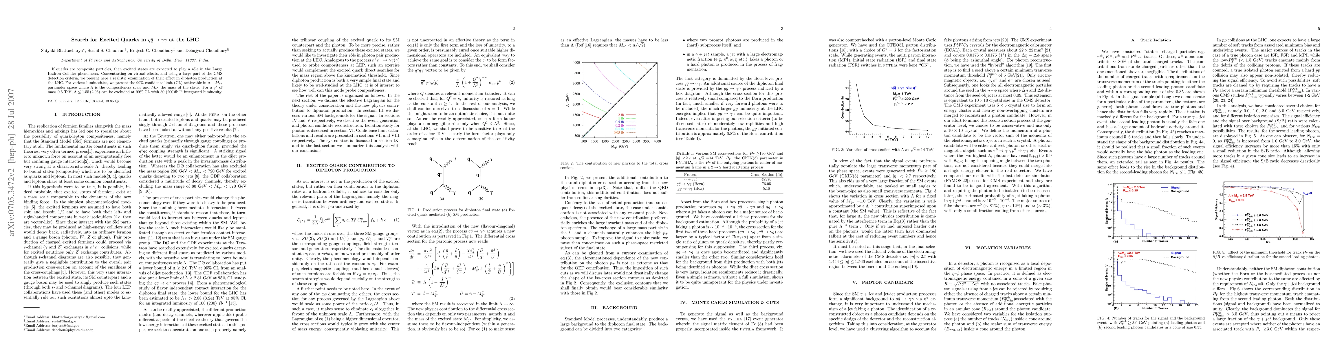 If quarks are composite particles, then excited states are expected to play a r\^ole in the Large Hadron Collider phenomena. Concentrating on virtual effects, and using a large part of the CMS detection criteria, we present here a realistic examination of their effect in diphoton production at the LHC. For various luminosities, we present the 99 % confidence limit (CL) achievable in $\Lambda-M_{q*}$ parameter space where $\Lambda$ is the compositeness scale and M_{q^*} the mass of the state. For a q^* of mass 0.5 TeV, $\Lambda \leq 1.55 (2.95)$ can be excluded at 99% CL with 30 (200)${\rm fb}^{-1}$ integrated luminosity.