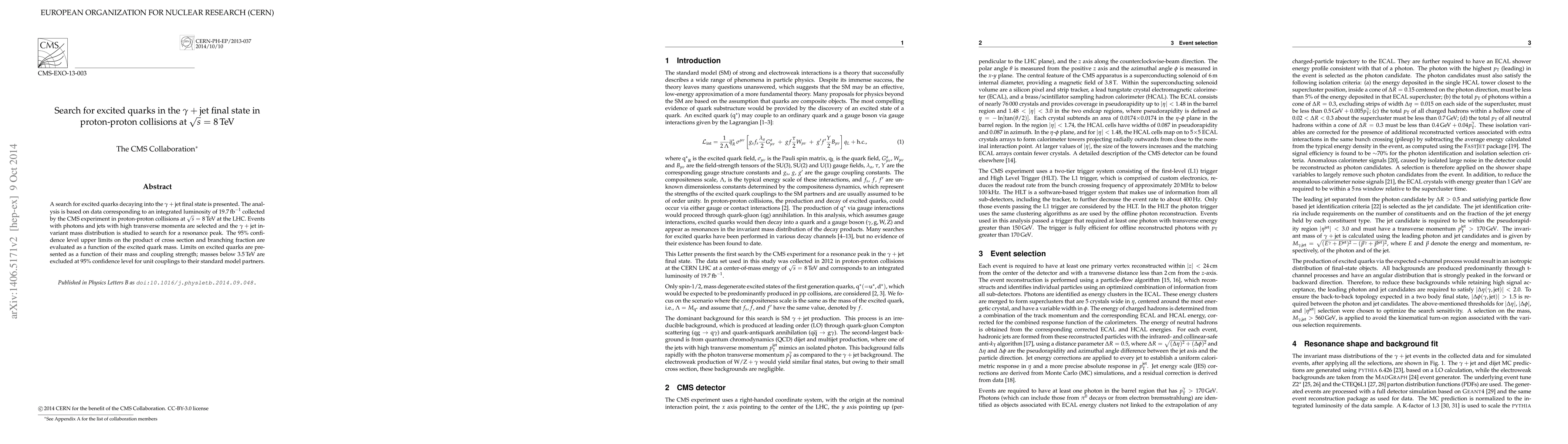 Researchers searched for excited quarks in proton-proton collisions using CMS data at 8 TeV, finding limits on their masses below 3.5 TeV for unit couplings.