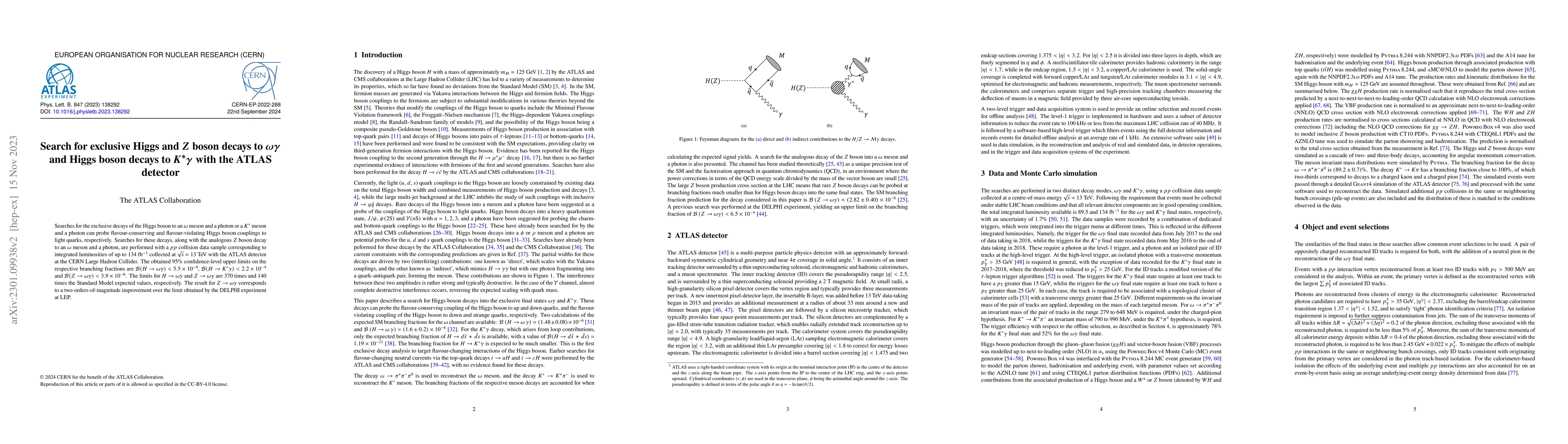 This paper reports searches for exclusive Higgs and $Z$ boson decays to $\omega\gamma$ and $K^{*}\gamma$ using the ATLAS detector at the LHC, finding upper limits on branching fractions that exceed Standard Model predictions by significant factors. The $Z\rightarrow \omega\gamma$ limit shows a two-order-of-magnitude improvement over previous DELPHI results.