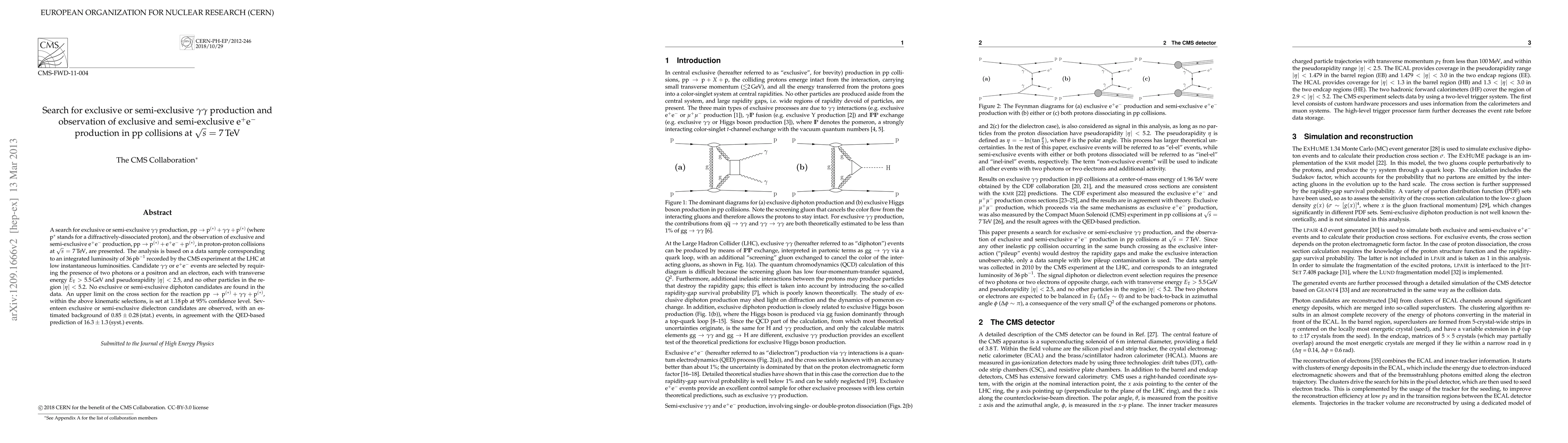 A search for exclusive or semi-exclusive photon pair production, pp to p(*) + photon pair + p(*) (where p(*) stands for a diffractively-dissociated proton), and the observation of exclusive and semi-exclusive electron pair production, pp to p(*) + ee + p(*), in proton-proton collisions at sqrt(s) = 7 TeV, are presented. The analysis is based on a data sample corresponding to an integrated luminosity of 36 inverse picobarns recorded by the CMS experiment at the LHC at low instantaneous luminosities. Candidate photon pair or electron pair events are selected by requiring the presence of two photons or a positron and an electron, each with transverse energy ET > 5.5 GeV and pseudorapidity abs(eta) < 2.5, and no other particles in the region abs(eta) < 5.2. No exclusive or semi-exclusive diphoton candidates are found in the data. An upper limit on the cross section for the reaction pp to p(*) + photon pair + p(*), within the above kinematic selections, is set at 1.18 pb at 95% confidence level. Seventeen exclusive or semi-exclusive dielectron candidates are observed, with an estimated background of 0.85 +/- 0.28 (stat.) events, in agreement with the QED-based prediction of 16.3 +/- 1.3 (syst.) events.