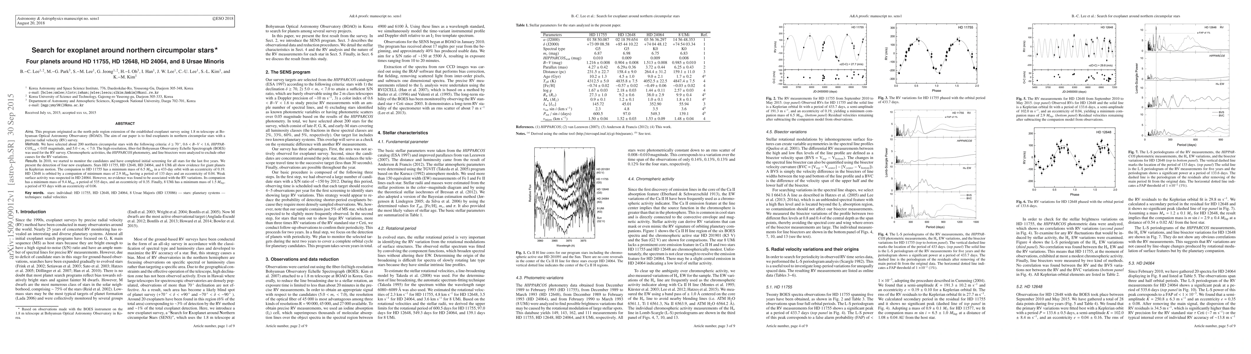 This study aims to identify exoplanets around northern circumpolar stars using a radial velocity survey with the Bohyunsan Observatory Echelle Spectrograph. Four new exoplanets were detected orbiting HD 11755, HD 12648, HD 24064, and 8 Ursae Minoris, with varying masses and orbital periods.