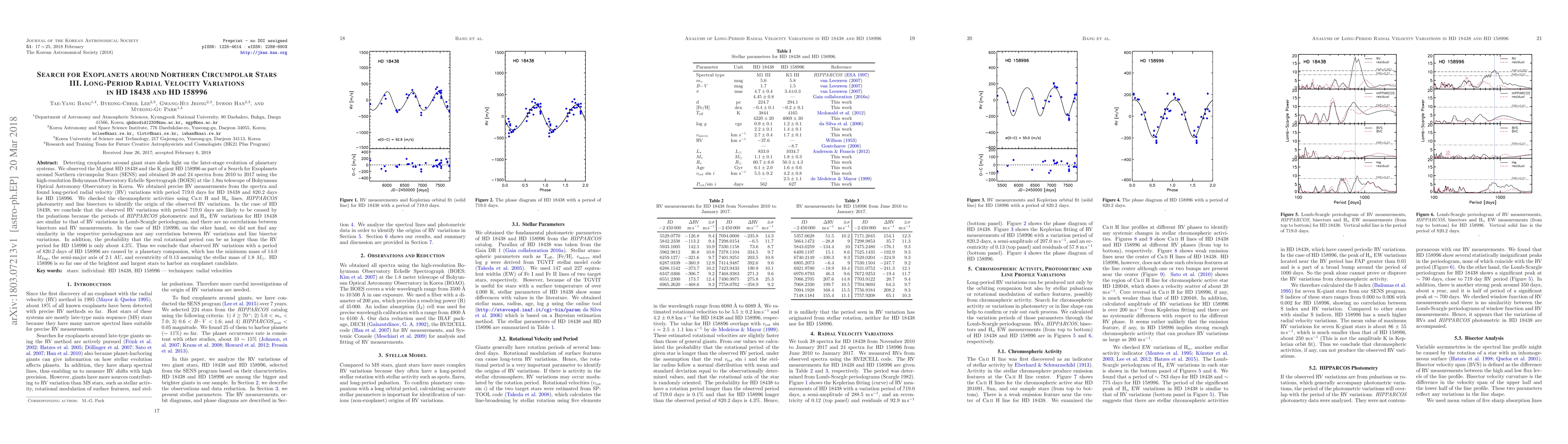 Detecting exoplanets around giant stars sheds light on the later-stage evolution of planetary systems. We observed the M giant HD 18438 and the K giant HD 158996 as part of a Search for Exoplanets around Northern circumpolar Stars (SENS) and obtained 38 and 24 spectra from 2010 to 2017 using the high-resolution Bohyunsan Observatory Echelle Spectrograph (BOES) at the 1.8m telescope of Bohyunsan Optical Astronomy Observatory in Korea. We obtained precise RV measurements from the spectra and found long-period radial velocity (RV) variations with period 719.0 days for HD 18438 and 820.2 days for HD 158996. We checked the chromospheric activities using Ca ii H and H_alpha lines, HIPPARCOS photometry and line bisectors to identify the origin of the observed RV variations. In the case of HD 18438, we conclude that the observed RV variations with period 719.0 days are likely to be caused by the pulsations because the periods of HIPPARCOS photometric and H alpha EW variations for HD 18438 are similar to that of RV variations in Lomb-Scargle periodogram, and there are no correlations between bisectors and RV measurements. In the case of HD 158996, on the other hand, we did not find any similarity in the respective periodograms nor any correlation between RV variations and line bisector variations. In addition, the probability that the real rotational period can be as longer than the RV period for HD 158996 is only about 4.3%. Thus we conclude that observed RV variations with a period of 820.2 days of HD 158996 are caused by a planetary companion, which has the minimum mass of 14.0 MJup, the semi-major axis of 2.1 AU, and eccentricity of 0.13 assuming the stellar mass of 1.8 M_sun. HD 158996 is so far one of the brightest and largest stars to harbor an exoplanet candidate.