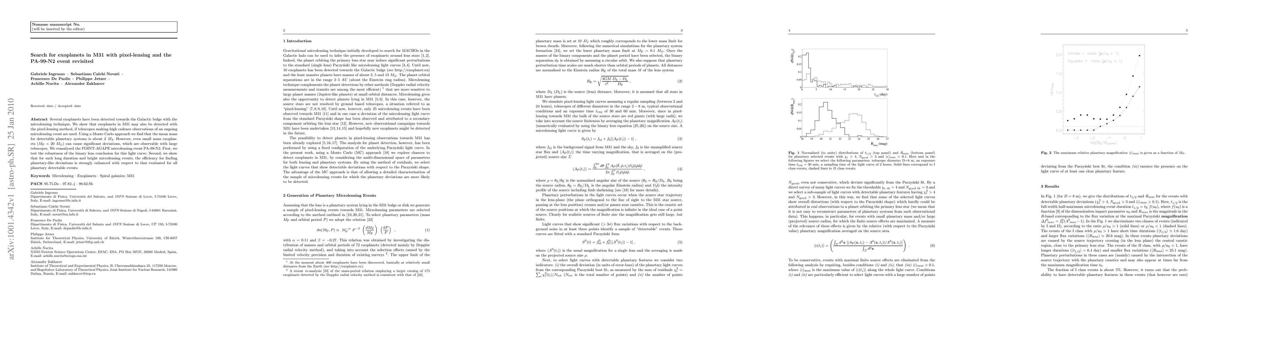 Several exoplanets have been detected towards the Galactic bulge with the microlensing technique. We show that exoplanets in M31 may also be detected with the pixel-lensing method, if telescopes making high cadence observations of an ongoing microlensing event are used. Using a Monte Carlo approach we find that the mean mass for detectable planetary systems is about $2 M_{\rm {J}}$. However, even small mass exoplanets ($M_{\rm P} < 20 M_{\oplus}$) can cause significant deviations, which are observable with large telescopes. We reanalysed the POINT-AGAPE microlensing event PA-99-N2. First, we test the robustness of the binary lens conclusion for this light curve. Second, we show that for such long duration and bright microlensing events, the efficiency for finding planetary-like deviations is strongly enhanced with respect to that evaluated for all planetary detectable events.