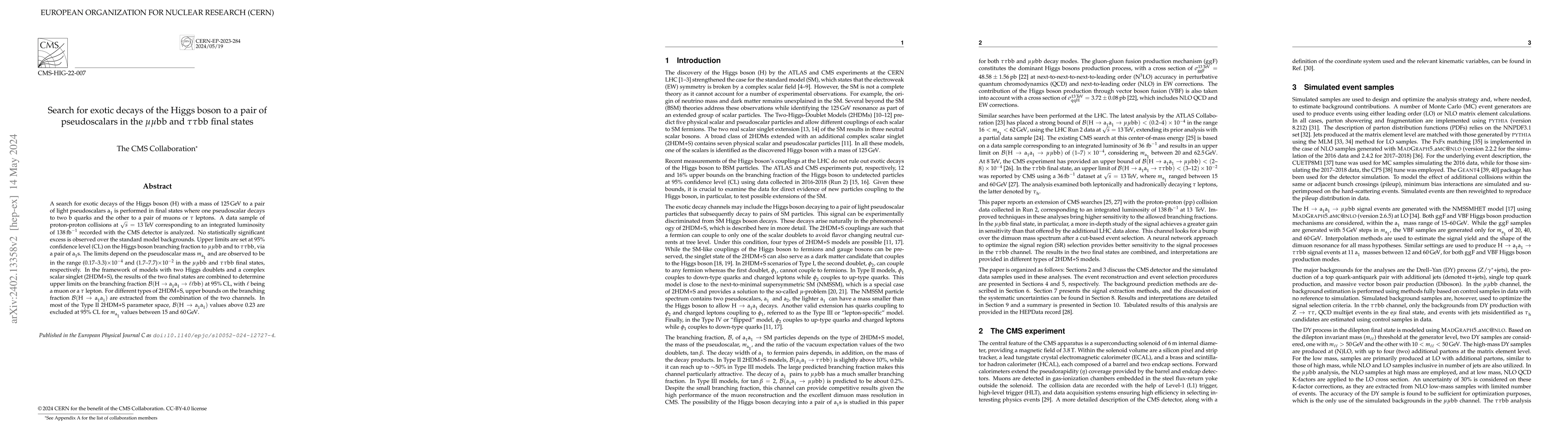 The CMS experiment investigates exotic Higgs boson decays to a pair of pseudoscalars in $\mu\mu$bb and $\tau\tau$bb final states, finding no significant deviations from standard model predictions and setting upper limits on the branching fractions.