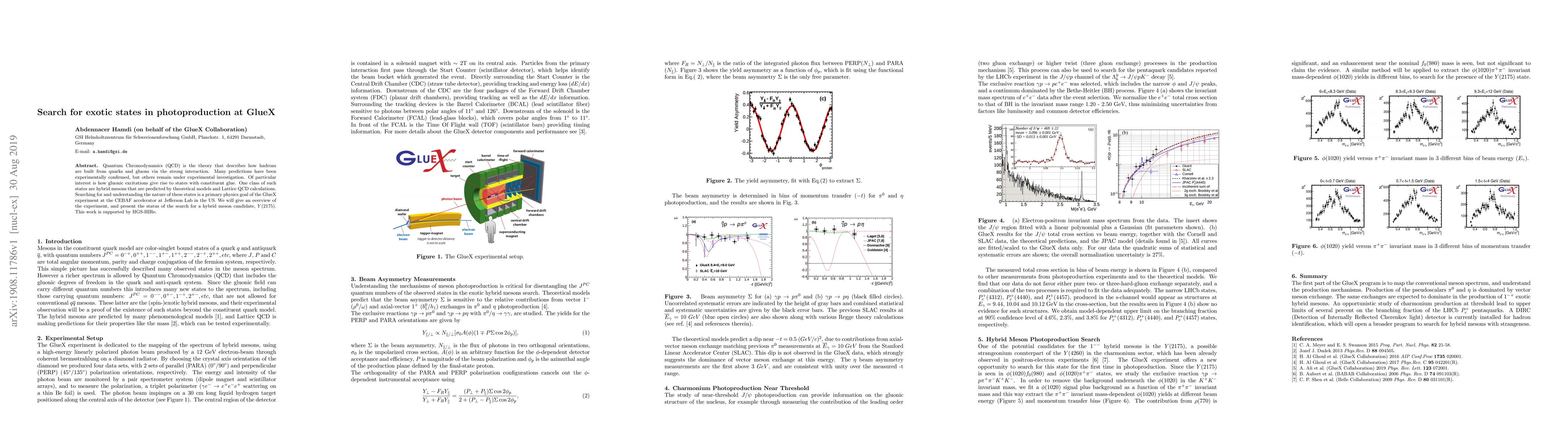 The GlueX experiment at the CEBAF accelerator aims to investigate exotic states, including hybrid mesons, predicted by QCD. The paper provides an overview of the experiment and reports on the current status of the search for the hybrid meson candidate Y (2175).