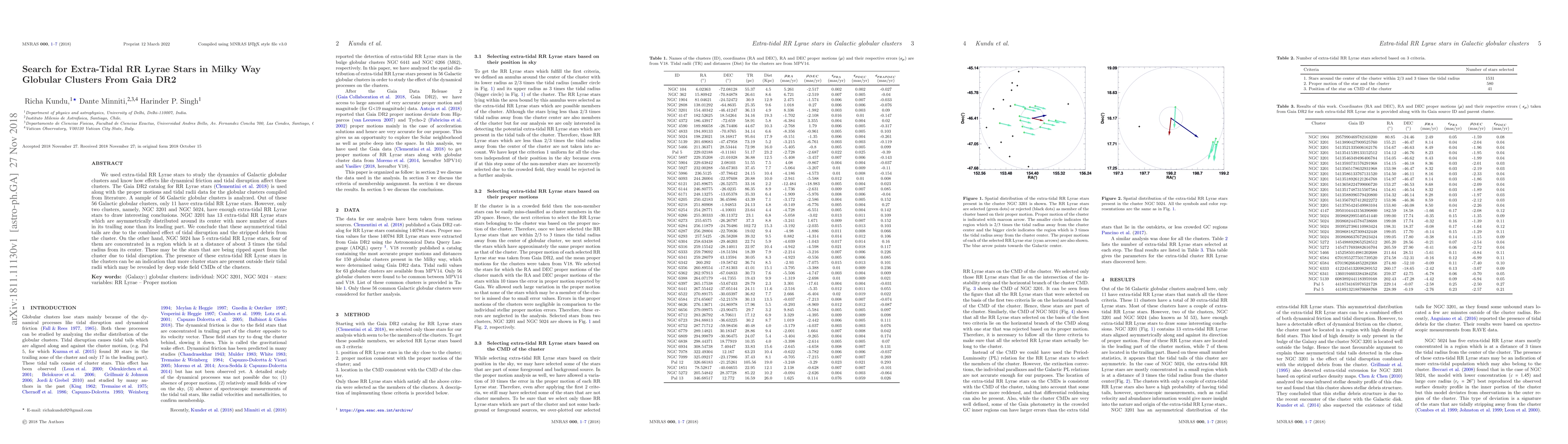 We used extra-tidal RR Lyrae stars to study the dynamics of Galactic globular clusters and know how effects like dynamical friction and tidal disruption affect these clusters. The Gaia DR2 catalog for RR Lyrae stars (Clementini et al. 2018) is used along with the proper motions and tidal radii data for the globular clusters compiled from literature. A sample of 56 Galactic globular clusters is analyzed. Out of these 56 Galactic globular clusters, only 11 have extra-tidal RR Lyrae stars. However, only two clusters, namely, NGC 3201 and NGC 5024, have enough extra-tidal RR Lyrae stars to draw interesting conclusions. NGC 3201 has 13 extra-tidal RR Lyrae stars which are asymmetrically distributed around its center with more number of stars in its trailing zone than its leading part. We conclude that these asymmetrical tidal tails are due to the combined effect of tidal disruption and the stripped debris from the cluster. On the other hand, NGC 5024 has 5 extra-tidal RR Lyrae stars, four of them are concentrated in a region which is at a distance of about 3 times the tidal radius from its center. These may be the stars that are being ripped apart from the cluster due to tidal disruption. The presence of these extra-tidal RR Lyrae stars in the clusters can be an indication that more cluster stars are present outside their tidal radii which may be revealed by deep wide field CMDs of the clusters.