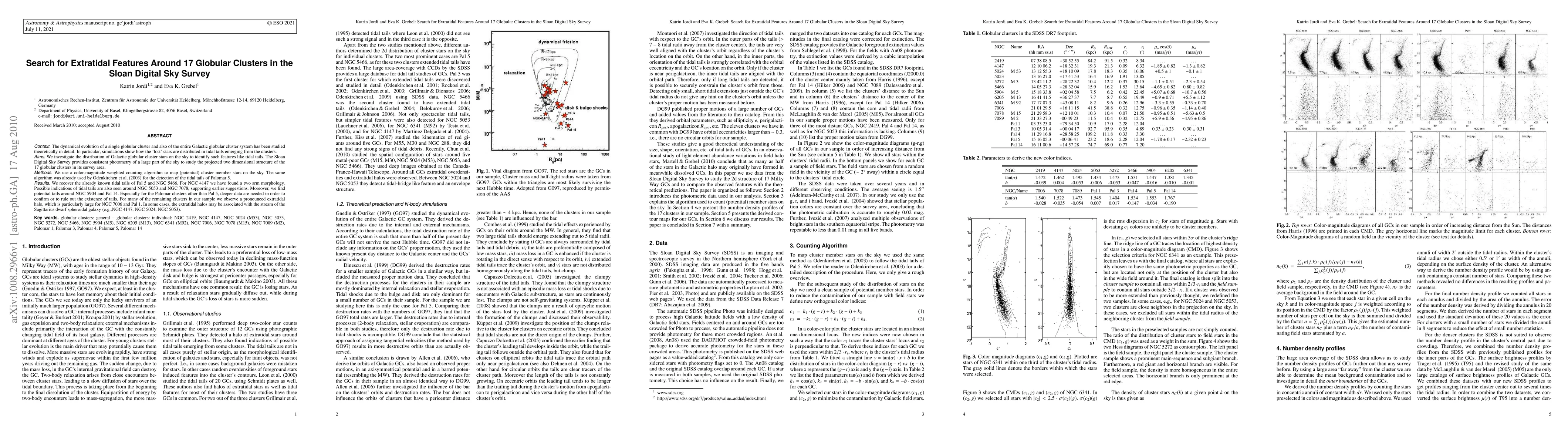 The dynamical evolution of a single globular cluster and also of the entire Galactic globular cluster system has been studied theoretically in detail. In particular, simulations show how the 'lost' stars are distributed in tidal tails emerging from the clusters. We investigate the distribution of Galactic globular cluster stars on the sky to identify such features like tidal tails. The Sloan Digital Sky Survey provides consistent photometry of a large part of the sky to study the projected two dimensional structure of the 17 globular clusters in its survey area. We use a color-magnitude weighted counting algorithm to map (potential) cluster member stars on the sky. We recover the already known tidal tails of Pal 5 and NGC 5466. For NGC 4147 we have found a two arm morphology. Possible indications of tidal tails are also seen around NGC 5053 and NGC 7078, supporting earlier suggestions. Moreover, we find potential tails around NGC 5904 and Pal 14. Especially for the Palomar clusters than Pal 5, deeper data are needed in order to confirm or to rule out the existence of tails. For many of the remaining clusters in our sample we observe a pronounced extratidal halo, which is particularly large for NGC 7006 and Pal 1. In some cases, the extratidal halos may be associated with the stream of the Sagittarius dwarf spheroidal galaxy (e.g.,NGC 4147, NGC 5024, NGC 5053).