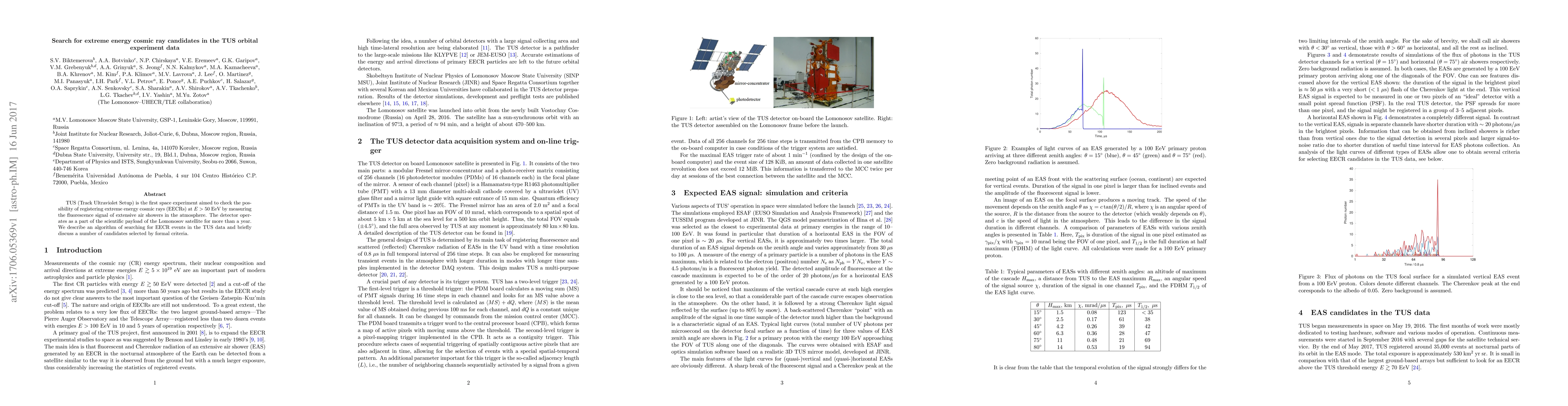 TUS (Track Ultraviolet Setup) is the first space experiment aimed to check the possibility of registering extreme energy cosmic rays (EECRs) at E>50 EeV by measuring the fluorescence signal of extensive air showers in the atmosphere. The detector operates as a part of the scientific payload of the Lomonosov satellite for more than a year. We describe an algorithm of searching for EECR events in the TUS data and briefly discuss a number of candidates selected by formal criteria.