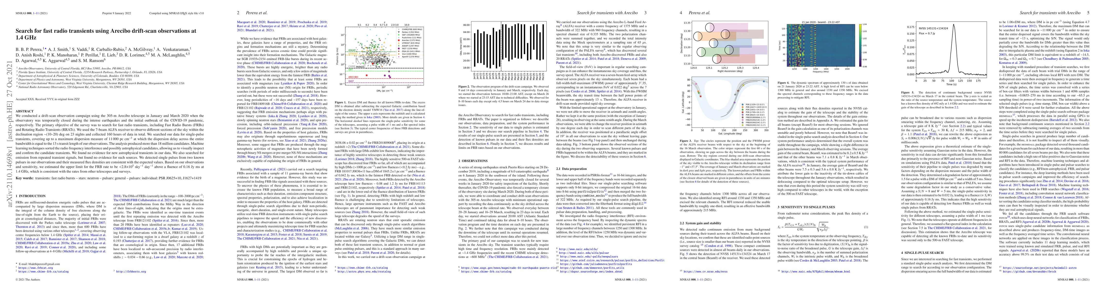 The Arecibo telescope detected over 18 million radio frequency candidates in a search for fast radio transients, including Fast Radio Bursts (FRBs) and Rotating Radio Transients (RRATs), with no new astrophysical transients found.