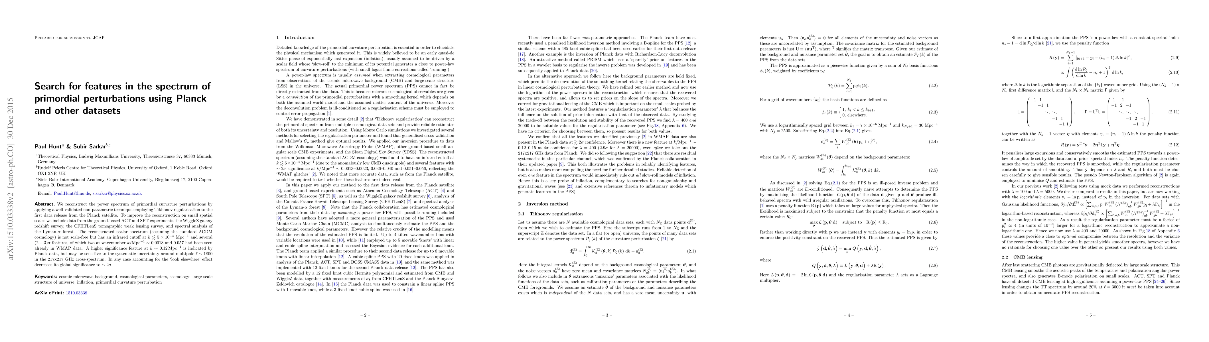 We reconstruct the power spectrum of primordial curvature perturbations by applying a well-validated non-parametric technique employing Tikhonov regularisation to the first data release from the Planck satellite. To improve the reconstruction on small spatial scales we include data from the ground-based ACT and SPT experiments, the WiggleZ galaxy redshift survey, the CFHTLenS tomographic weak lensing survey, and spectral analysis of the Lyman-alpha forest. The reconstructed scalar spectrum (assuming the standard LCDM cosmology) is not scale-free but has an infrared cutoff at k < 5 x 10^-4 Mpc^-1 and several ~2-3 sigma features, of which two at wavenumber k/Mpc^-1 ~ 0.0018 and 0.057 had been seen already in WMAP data. A higher significance feature at k ~ 0.12 Mpc^-1 is indicated by Planck data, but may be sensitive to the systematic uncertainty around multipole l ~ 1800 in the 217x217 GHz cross-spectrum. In any case accounting for the 'look elsewhere' effect drops its global significance to ~2 sigma.