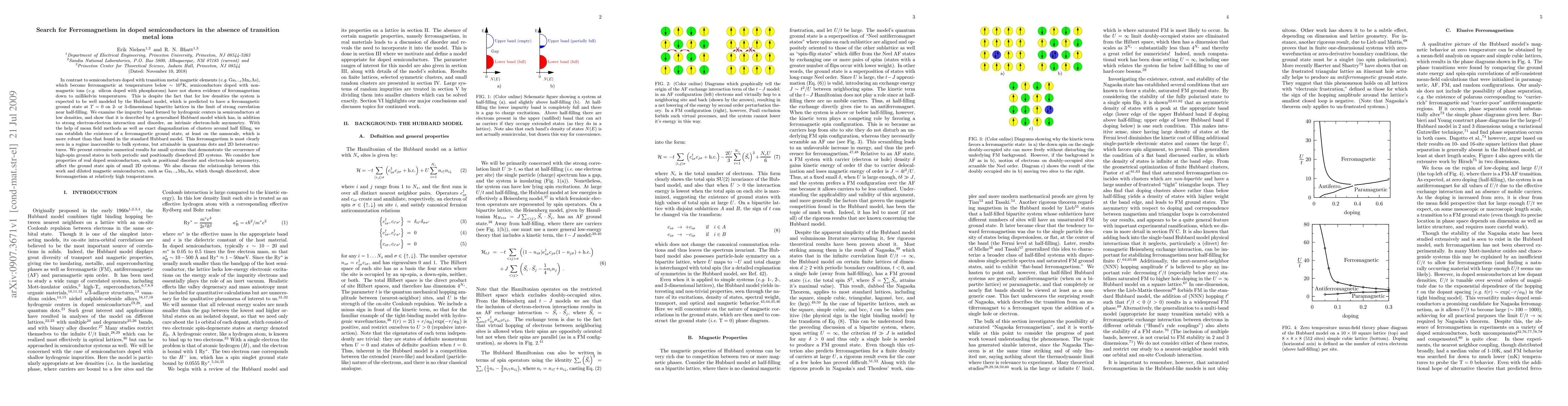 This paper explores the absence of ferromagnetism in semiconductors doped with non-magnetic ions like phosphorus in silicon, despite theoretical predictions. It demonstrates that a generalized Hubbard model, incorporating electron-hole asymmetry and disorder, can predict a nanoscale ferromagnetic ground state in low-density impurity bands, particularly observable in quantum dots and 2D heterostructures.