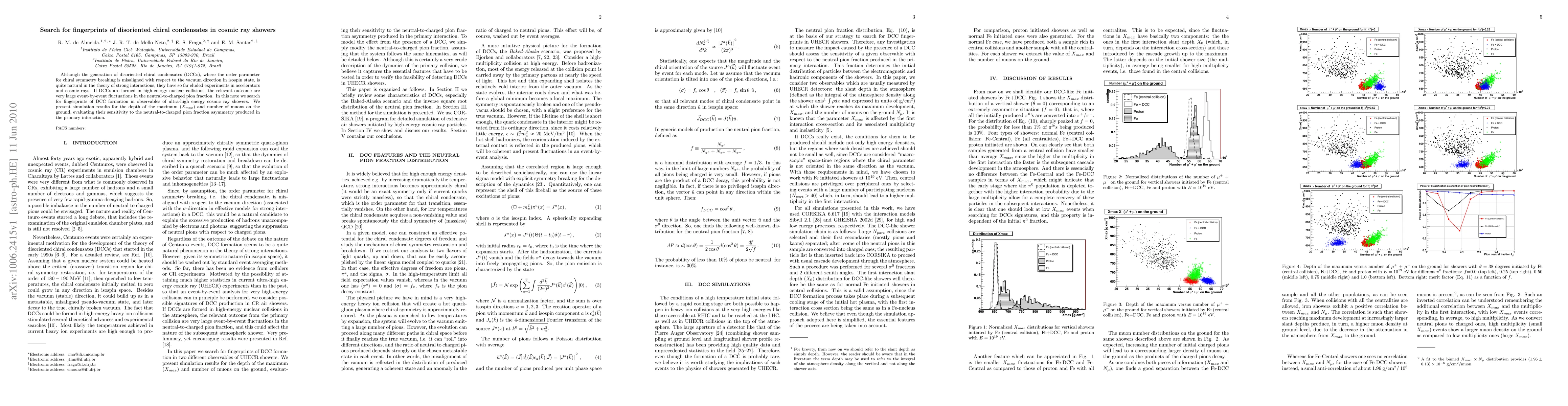 Although the generation of disoriented chiral condensates (DCCs), where the order parameter for chiral symmetry breaking is misaligned with respect to the vacuum direction in isospin state, is quite natural in the theory of strong interactions, they have so far eluded experiments in accelerators and cosmic rays. If DCCs are formed in high-energy nuclear collisions, the relevant outcome are very large event-by-event fluctuations in the neutral-to-charged pion fraction. In this note we search for fingerprints of DCC formation in observables of ultra-high energy cosmic ray showers. We present simulation results for the depth of the maximum ($X_{max}$) and number of muons on the ground, evaluating their sensitivity to the neutral-to-charged pion fraction asymmetry produced in the primary interaction.