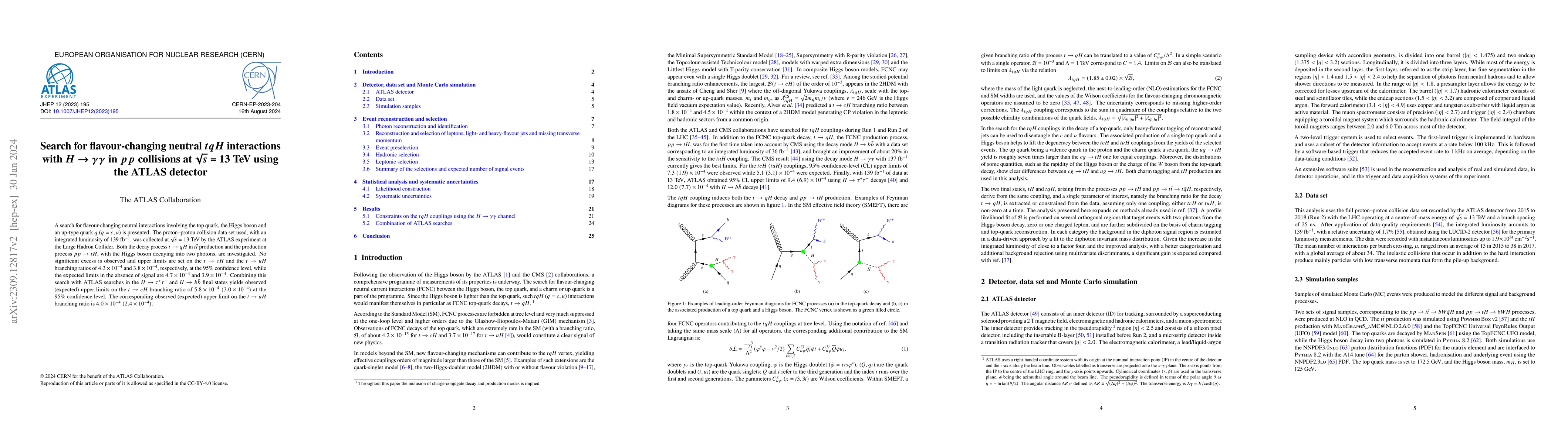 This paper investigates flavor-changing neutral interactions involving the top quark, Higgs boson, and up-type quark using ATLAS data from 13 TeV proton-proton collisions. No significant excess is observed, setting upper limits on $t\rightarrow cH$ and $t\rightarrow uH$ branching ratios at 95% confidence level.