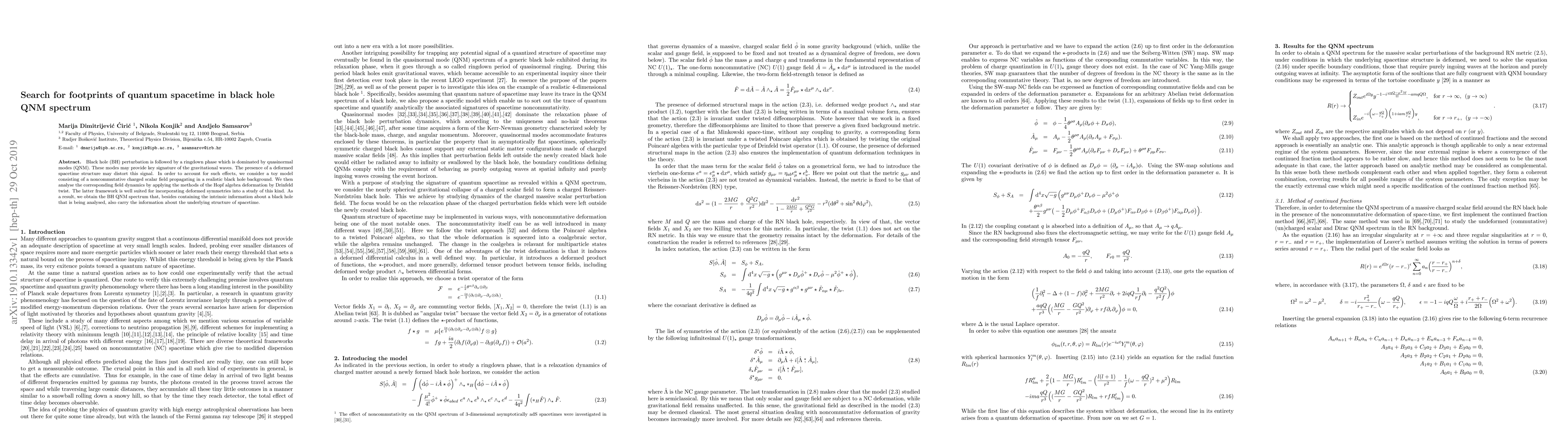 Black hole (BH) perturbation is followed by a ringdown phase which is dominated by quasinormal modes (QNM). These modes may provide key signature of the gravitational waves. The presence of a deformed spacetime structure may distort this signal. In order to account for such effects, we consider a toy model consisting of a noncommutative charged scalar field propagating in a realistic black hole background. We then analyse the corresponding field dynamics by applying the methods of the Hopf algebra deformation by Drinfeld twist. The latter framework is well suited for incorporating deformed symmetries into a study of this kind. As a result, we obtain the BH QNM spectrum that, besides containing the intrinsic information about a black hole that is being analysed, also carry the information about the underlying structure of spacetime.